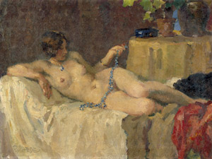 Idyllische Szene mit entkleideter Schäferin an einem See