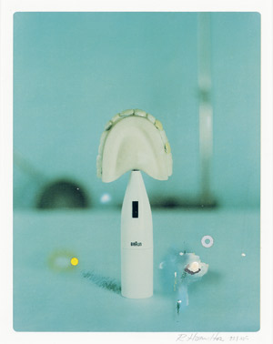Richard Hamilton hegte eine tiefe Bewunderung für das klare, schlichte Design der Braun-Produkte von Dieter Rams, die immer wieder in seinen Kunstwerken auftauchen. Hier ist es eine elektrische Zahnbürste, im Ready-made vereinigt mit einem künstlichen Gebiss als Aufsatz, das anfing zu klappern, sobald das Gerät angeschaltet wurde. Die mit glänzender Kunststoffolie laminierte Oberfläche verleiht im Kontrast zu dem matten Weiß des Siebdruckes im Rand der Arbeit den Charakter einer Fotografie. Es entsteht ein Dialog zwischen fotomechanischer und Handarbeit mit Bezügen zu Marcel Duchamp, dessen Retrospektivausstellung Hamilton etwa zeitgleich in der Tate Gallery organisierte. Der Titel der Arbeit erinnert an Jasper Johns' "The critic smiles". Etwas später schuf der Künstler ein Multiple und einen kurzen Film zum gleichen Motiv. Herausgegeben von der Documenta IV Foundation Kassel, gedruckt im Kelpra Studio, London. Das fotografierte Ready-made mit elektrischer Zahnbürste und Gebiss entstand in Zusammenarbeit mit Euan Duff. Prachtvoller Druck mit dem vollen Rand.