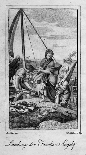 Robinsonaden. - Egloffstein, H. A. C. Der neue holsteinische Robinson oder Entdeckung und Bevölkerung der Insel Angely. Ein Lesebuch zur Belehrung und Unterhaltung für die Jugend. Gegenstück zu Campe's Robinson. IV, 288 S., 2 Bl. Mit gestochenem Frontispiz von C. V. Schellhorn und 8 kolorierten Kupfertafeln. 16,5 x 10,5 cm. Illustrierter OPappband (berieben und bestoßen, Rückenbezug am oberen Kapital etwas gelöst). Nürnberg, C. H. Zeh, (1821).