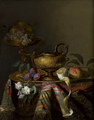 2. Hälfte 17. Jh. Stillleben mit Prunksilber, Pflaumen und exotischen Früchten