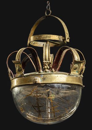 um 1787. Kronenkompass, auf der Glashalbkugel die Zeichnung eines Zweimasters