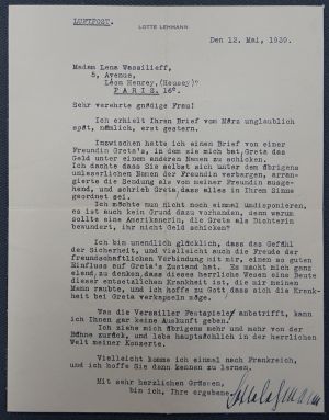 "... Inzwischen hatte ich einen Brief von einer Freundin Greta's, in dem sie mich bat, Greta das Geld unter einem anderen Namen zu schicken. Ich dachte, dass Sie selbst sich unter dem übrigens unleserlichen Namen der Freundin verbargen, arrangierte die Sendung als von einer Freundin ausgehend, und schrieb Greta, dass alles in Ihrem Sinne geordnet sei ... Ich bin unendlich glücklich, dass das Gefühl der Sicherheit, und vielleicht auch die Freude der freundschaftlichen Verbindung mit mir, einen so guten Einfluss auf Greta's Zustand hat. Es macht mich ganz elend, zu denken, dass dieses herrliche Wesen eine Beute dieser entsetzlichen Krankheit ist, die mir meinen Mann raubte, und ich hoffe zu Gott, dass sich die Krankheit bei Greta verkapseln möge ... Ich ziehe mich übrigens mehr und mehr von der Bühne zurück, und lebe hauptsächlich in der herrlichen Welt meiner Konzerte ..." [Mai 1939]. - Im Januar 1949 schreibt sie an Gertrud Bauer -Schwind, nachdem diese ihr Exemplare (eines für Thomas Mann) des letzten Gedichtbandes ihrer Tochter geschickt hatte.
