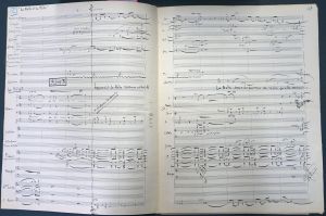 Eine volle Partiturseite aus den 1919/20 komponierten "Agrestides - 3 fresques symphoniques pour orchestre" für großes Orchester. - Ab 1937 lehrte Migot an der Pariser Schola Cantorum und produzierte Musiksendungen für Radio-Cité (1937-39). Von 1949 bis 1961 war er Konservator des Instrumentenmuseums am Pariser Conservatoire. 1958 erhielt er von der SACEM den "Grand-Prix de la musique française" zugesprochen. - Schönes Blatt.