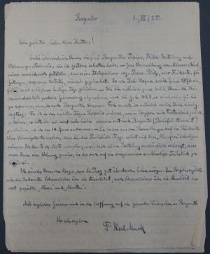 Teilweise inhaltsreiche Briefe an den holländischen Organisten und Musikschriftsteller Herman Rutters (1879-1961) in Amsterdam. Ein Brief erklärt, warum der Hamburger "Karl-Muck-Platz" in neuerer Zeit in "Johannes Brahms-Platz" umbenannt wurde. "... Je älter ich werde, desto mehr komme ich zur Ueberzeugung, dass man in meinem Handwerk eigentlich immer nur zu einer verschwindenden Minorität spricht; d. h. dass in der grossen Menge stets nur einige wenige Menschen sind, die so ganz verstehen, was man eigentlich anstrebt, und wo die höchsten, unerreichbaren Ziele liegen. Sie haben für Ihre Bewerthung meiner Bestrebungen und meines künstlerischen Bekenntnisses in Ihrem Briefe so schönen Ausdruck gefunden, dass ich schon deshalb nicht bedaure, noch einmal nach Amsterdam gekommen zu sein ...". Nennt seine Hamburger Adresse und fügt hinzu: "Und für event. Billet- und Wohnung-Bestellung in Bayreuth genügt ja auch meine dortige Adresse: Parsifal-Strasse 8 ..." [Amsterdam 7.IV.1925]. Aus Rapallo schreibt er im Juni: "... Anbei übersende ich Ihnen die zwei Bayreuther Papiere, Billet-Bestellung und Wohnungs-Nachweis ... Zur Vermeidung von Missverständnissen muss ich noch feststellen, dass es im Festspielhaus sog. Presse-Plätze, also Freikarten für Zeitungen, resp. deren Vertreter, niemals gegeben hat. So wie Rich. Wagner das im Jahre 1876 einführte, so ist es bis zum heutigen Tage geblieben. - Ich bin natürlich gerne bereit, Ihnen die Unannehmlichkeit postaler Geldsendung abzunehmen und die ... 422,00 einstweilen für Sie zu deponiren, wenn ich nach Bayreuth komme ... Ich wünsche Ihnen von Herzen, dass Sie Prag gut überstanden haben mögen. Im Vorjahre erzählte mir ein Bekannter Schauerliches über die Quantität, noch Schauerlicheres über die Qualität der dort gespielten 'Neuen' und 'Neuesten' [Rapallo 1.VI.1925] ... Also grosse Begeisterung bei dem Jazzband-C[once]rt? Sie Armer, der Sie so Etwas anhören und gar noch darüber schreiben müssen! Dieser Whiteman ist ein amerikanisirter deutsch-polnischer Jude namens Weissmann. Die Jazz-'Musik' ist eine ausschließlich jüdische Erfindung; Sam Cohen (Cohn), Jack Levinne (Levy) etc. sind die Haupt-'Komponisten', die mit ihrem Dreck Millionen verdient haben. Es ist die alte Geschichte: das jüdische Zersetzungs- und Zerstörungs-Werk; hier am Musik-Geschmack. Und der blöde nicht-jüdische Pöbel geht auch hier wieder den Juden in's Garn. - Wie ich höre, hat wenigstens in Deutschland die ernste Musik-Kritik scharf Front gemacht gegen den Versuch, den Jazz-Mist als 'Concert'-Kost zu serviren ... " [Baden-Baden 11.VII.1926]. Ferner ausführlich über Karten für Bayreuth und für die Münchener Oper: " ... Sie finden anbei je zwei Karten zu: 'Cosi fan tutte, 11. August ... Don Juan ... Zauberflöte ... Entführung ... Tristan ... Figaro 21. August ..." [München 7.VIII.1926]. - Diverse Beilagen: 1 Foto, das Muck mit 4 weiteren Personen, darunter die Sängerin Barbara Kemp, in Bayreuth zeigt. - 10 teils deutsche, teils holländische Zeitungsartikel über Muck. - 1 holländisches Konzertprogramm mit Muck als Dirigent (1925). - Den Hass auf Jazz-Musik teilte Muck mit dem ungefähr gleichaltrigen Kollegen Felix Weingartner, der sich in seinen Memoiren ähnlich abfällig äußert. - Alle Briefe gelocht; 1 Brief mit Tesafilm-Schaden an einer Ecke.