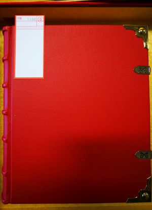 Stundenbuch für Rouen. Barb. lat. 487 der Biblioteca Apostolica Vaticana. Faksimile, Kommentar und Dokumentation. 2 Bände und 1 Heft. 21 x 14 cm. Rotes OLeder über Holzdeckeln mit reicher Goldprägung und dreiseitigem Goldschnitt bzw. OHalbleder mit goldgeprägtem RTitel, zusammen in OHalblederschuber (mit montiertem Schild). Stuttgart und Zürich, Belser, 1994.
