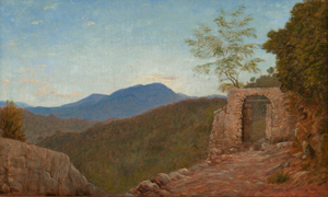 Öl auf Holz. 25,2 x 33,7 cm. Unten links monogrammiert und datiert "PR 1850", verso in dänischer Sprache handschift. bez. ein Etikett "No 28 [..] Raadsig", ein weiteres Etikett betitelt "6 / af Raadsig / Brond ved Cervarra i Sabiner[...]" sowie handschriftl. bez. "from Möller 1851".