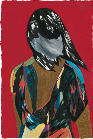 Farbenreiche Gouache der Chemnitzer Künstlerin Ivonne Dippmann. Nach ihrem Studium an der UdK Berlin, verbrachte Dippmann mehrere Jahre in Tel Aviv, Israel, wo sie neben Berlin heute lebt und arbeitet. Zu ihrem vielseitigen Œuvre zählen neben Zeichnung und Malerei auch Performances, Installationen und Filme. Auffällig ist das fast maskenhaft überdeckte und verborgen gehaltene Gesicht der dargestellten Frauenfigur, die goldene Farbe der Haut und das leuchtend farbige Textil.
