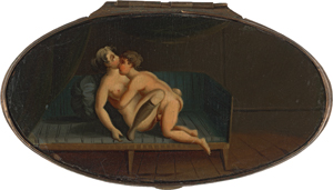 um 1820/1830. Tabatière aus schwarzem Lack mit Fassungen aus vergoldetem Metall, der Deckel in Lack bemalt mit einer Interieur-Szene: Nacktes weibliches Wesen mit gespreizten Schenkeln und schwarzen Kniestrümpfen, von einer nackten männlichen Person umarmt, auf grün gepolstertem Sofa. 6,1 x 10,6 x 2,4 cm (queroval).