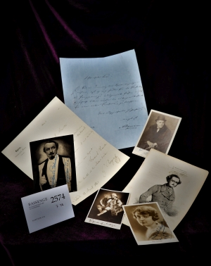 An Emilie Springer (1829-1862), Direktorin des Magdeburger Stadttheaters. „... Es thut mir unendlich leid Ihnen anzeigen zu müssen, daß ich mich heute für die Vorstellung des Propheten zu indisponirt fühle, weshalb ich höflichst bitten mögte, die nöthigen Anstalten für eine andre Vorstellung zu treffen ...". - Der Brief ist offenbar versehentlich in „Hannover" datiert (wo Niemann engagiert war), denn er ist auf Papier des „Hotels zur Stadt Braunschweig" in Magdeburg geschrieben, wo sich Niemann zweifellos bei seiner Abfassung aufhielt, wie aus dem "hier" bei der Adresse ersichtlich ist. - Dabei: Gustave Roger, gefeierter franz. Opernsänger, der erste "Prophet" in der Pariser Uraufführung (1815-1879). Eigh. Brief m. U. "G. Roger". 1 S. Gr. 4to. Paris 12.IV.1851. - An einen Minister, den er zu seiner Benefizvorstellung in der "Académie Nationale de Musique" einlädt. - Dazu ein (durch Druckerschwärze etwas beeinträchtigtes) lithogr. Porträt Rogers aus der Zeitschrift "Le Monde dramatique". - Ferner beigegeben: Opernsänger. 4 signierte Porträtfoto-Karten. 1928-1962. - Vorhanden: Michael Bohnen (als Napoleon III.), Richard Mayr (als Baron Ochs von Lerchenau), Leo Schützendorf und Grete Stückgold. - Jeweils original-photographische Abzüge mit Signatur auf der Bildseite. - Zus. 7 Teile.
