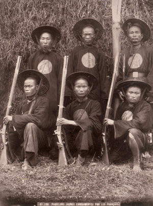 Photographer: Charles-Édouard Hocquard (1853-1911). Landscape views and portraits of people of Tonkin. 1887-88. 49 Woodburytypes (a few albumen prints). Each circa 21 x 15,5 cm and reverse and smaller. Some with titles in French in the negative in lower edge, mounted to gilt edge album boards (some time-staining, slight foxing at ends of album), bound in half leather album (scratches, scuff marks), marbled fly leaves and endpapers, with gilt-embossed title Voyage Autour du Monde, 1887-88, TONKIN, 33 x 45 cm.