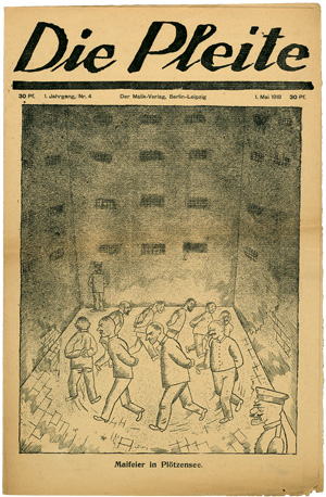Die Pleite. Illustrierte Halbmonatsschrift. Jahrgang I, Nr. 4. Verantwortlich für den gesamten Inhalt: Wieland Herzfelde. 4 S. Mit 3 Zeichnungen von George Grosz. Orig.-Doppelblatt. 40 x 26 cm ("Zeitungsformat"). Lose Blatt. Berlin und Leipzig 1. Mai 1919.