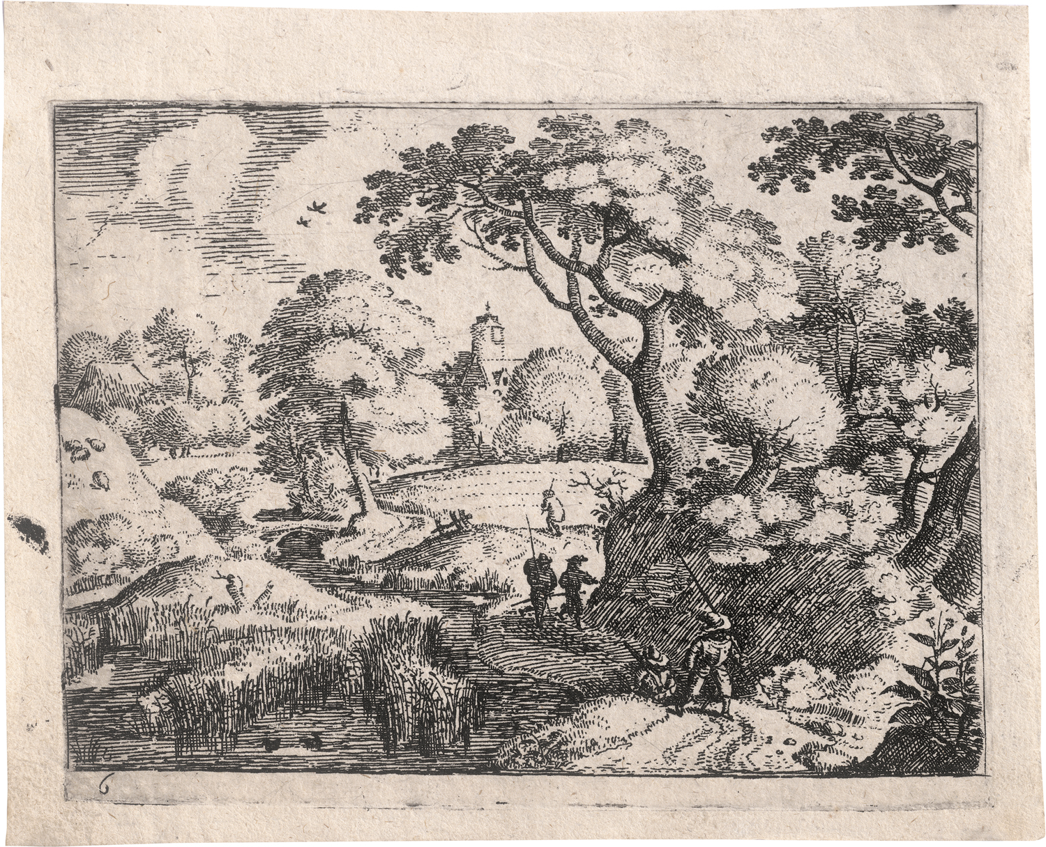 (um 1565 Kortrijk - 1603 Amsterdam)Landschaft mit Reisenden und einem Soldaten
