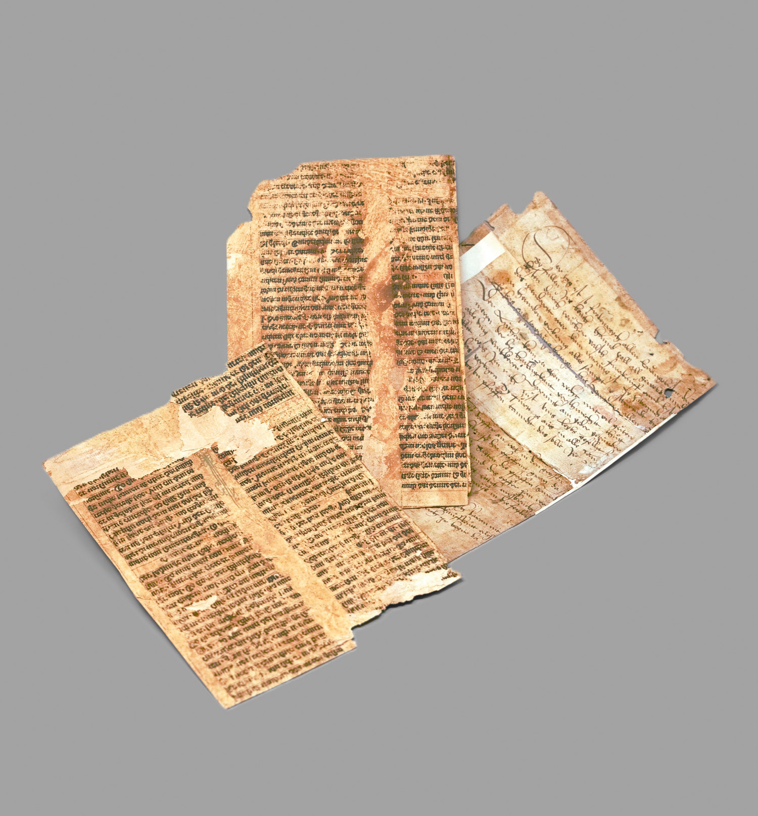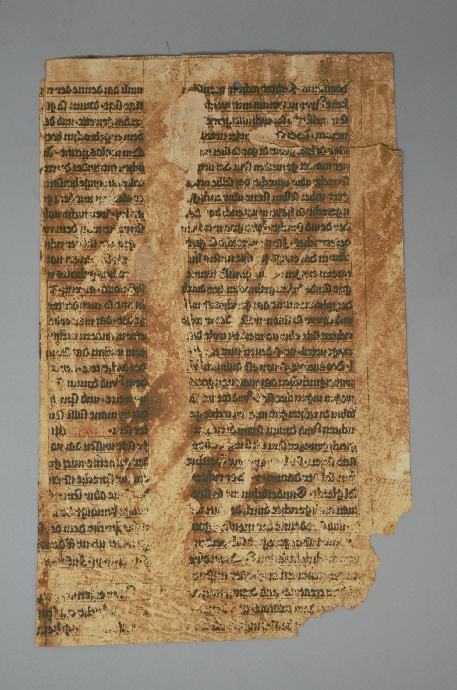 Zwei Fragmente einer hoch- bzw. frühspätmittelalterlichen Handschrift aus dem Magdeburger Stadtrecht mit Glossen, erhalten als spiegelverkehrter Abklatsch auf verleimtem Trägerpapier aus Karton. Vorhanden sind Fragmente von jeweils zwei Kolumnen in einer sauberen regelmäßigen Gotica textura. Identifiziert hat die Fragmente der Heidelberger Germanist und Mediävist Gerhard Eis (1908-1982). – Rote Tinte meist verblasst, bzw. unlesbar, da nicht auf das Trägerpapier mitübertragen, Aus- und Einbrüche, Textverluste - ein mittelalterliches Kuriosum. – Beiliegen: 2 weitere Blätter einer Handschrift aus der 2. Hälfte des 16. Jahrhunderts, möglicherweise aus der Handschrift, in deren Deckeln die beiden Spiegelfragmente stammen.
