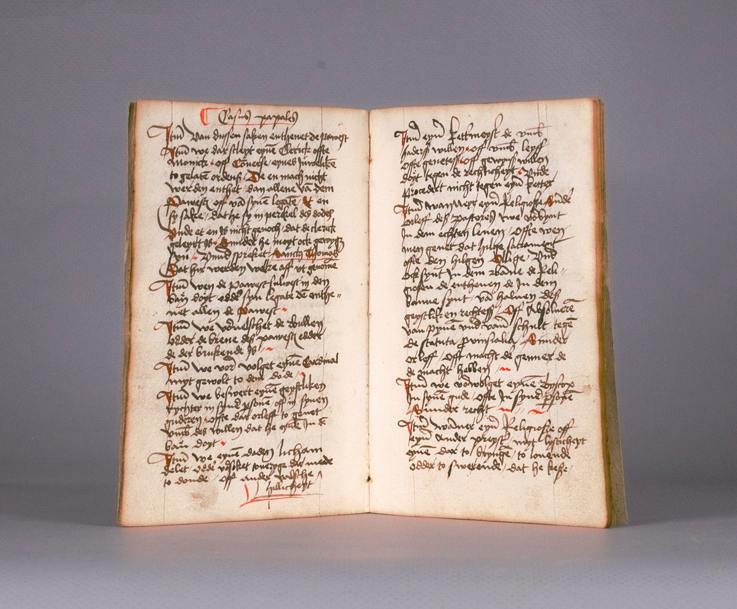 Salzweihe - Exorcismus salis. Lateinische-deutsche Handschrift auf Papier. 6 nn. Bl., 2 w. Bl. Ca. 22 Zeilen. Schrift: Bastarda. Schriftraum: 10,3 x 6,1 cm. Format: 13,2 x 10 cm. Mit etwas Rubrizierung (Kapitalstrichelung der ersten Doppelseite des deutschen Textes). Broschur des 18. Jahrhunderts (kleiner Abrieb und mehrere Sammlungsschildchen). Nordwestdeutschland (Westfalen?) 1. Drittel des 15. Jahrhunderts.
