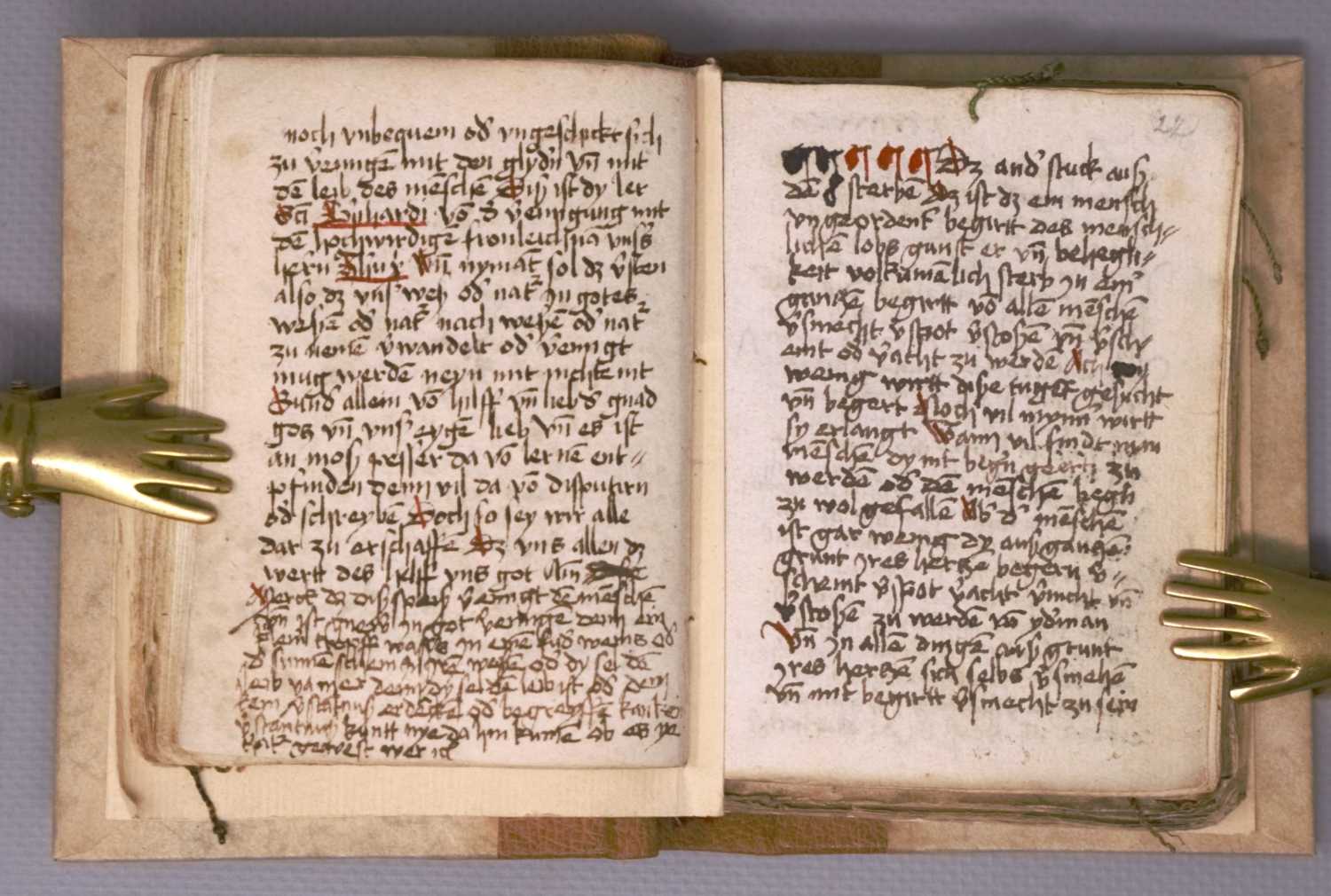 Fragment Nürnberger Predigten aus dem Zeitraum zwischen 1478 und 1492 im Dominikanerinnenkloster St. Katharina in Nürnberg entstanden. Das Fragment wurde aus Hs. 114 der Sammlung von Gerhard Eis entnommen; es befand sich dort hinter Bl. 259. Neben Predigten enthält dieses Fragment auch einige erbauliche Traktate und weitere Texte. Deutsche Handschrift auf Papier, 80 Bl. Bastarda von mehreren Händen (Nürnberger Dominikanerinnen). Schriftraum und Zeilenzahl wechselnd. Format: 10 x 7 cm. Durchgehend rubriziert mit Kapitalstrichelung, Absatzmarken, aber auch Durch- und Unterstreichungen in Rot. Modernes Halbleder. Dominikanerkloster St. Katharina Nürnberg, 1478-1492.