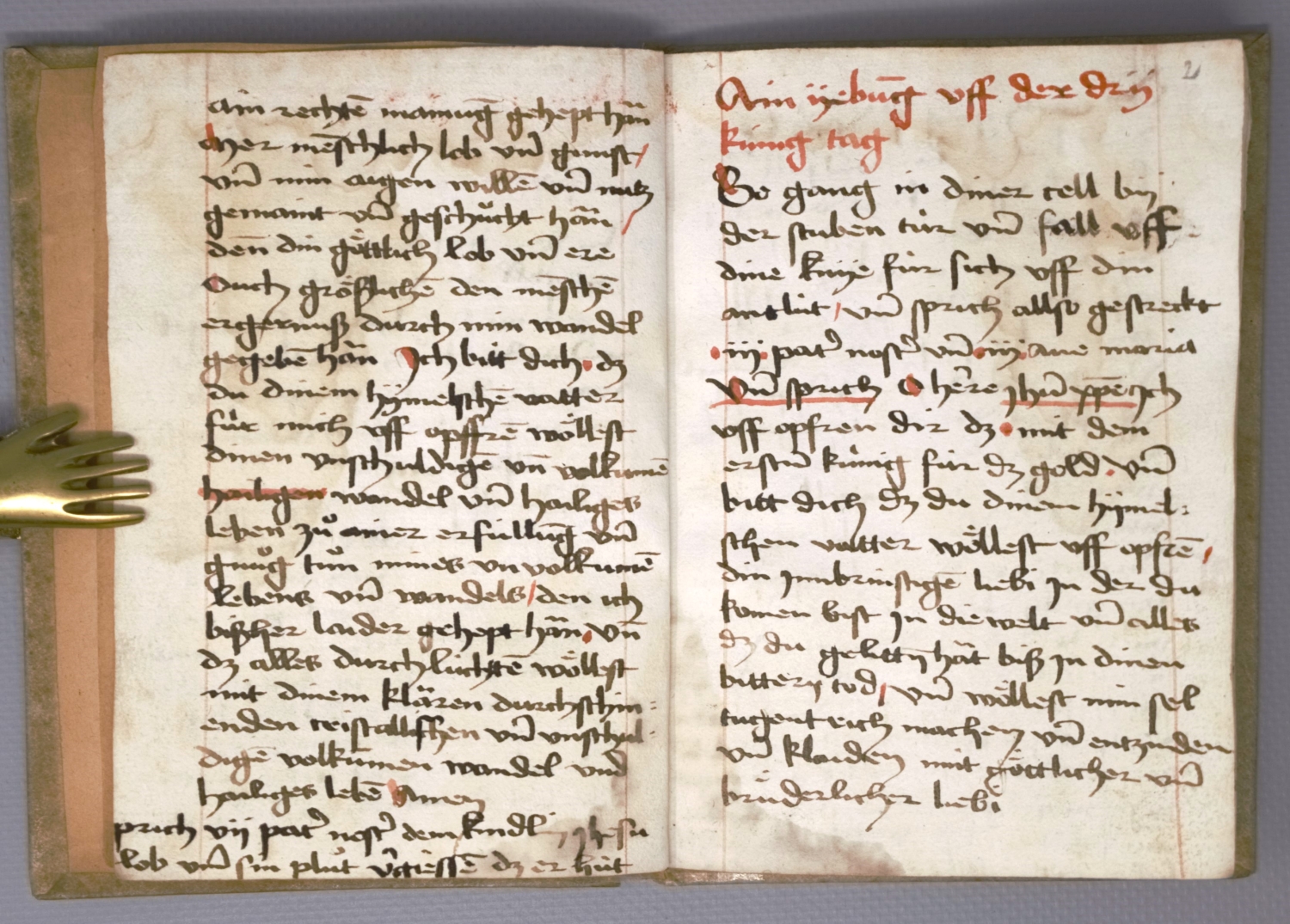 Die Handschrift ist damit eine Art Vademecum des Ordensbruders. Es folgt "Ain übung uff des drei kunig tag" (Fol. 2), dann "Gen Rom gän gaistlich", also Andachtsübungen zu einer inneren Pilgerfahrt nach Rom: "Ain übung uff den Sonetag nach dem achtenden der hailige drey kunig".