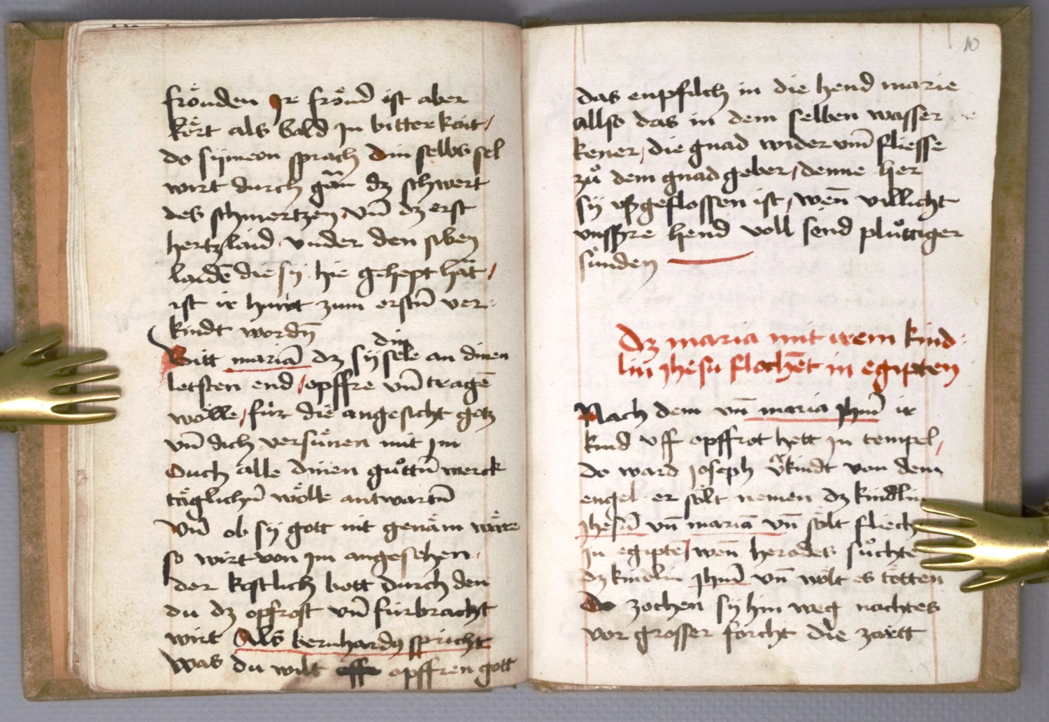 Übungen zu Maria Lichtmess schließen sich an (Fol. 5-8): "Ain übung und haymsuchung all tag aynost biß uff unsser frawentag lichtmess [...]", mit einem Zitat des Bernhard von Clairvaux: "Bernhardus der andächt lerer spricht An yegliche rechtgläubig sol und aller maist ain gaistlich orden mench (Mönch) soll zu tag aynost von dem tag der geburt xpi biß uff unsser frawe tag lichtmeß bey der kripp haym suchen, des kunin ihs (Jesus) und sin mutter und in da anbetten [...]". Ferner "Das maria mit irem kindlin jhesu flohetin egypten" (Fol. 10), "Uff unser frawen geburts tag", "Uff sant michels tag" und vieles mehr.