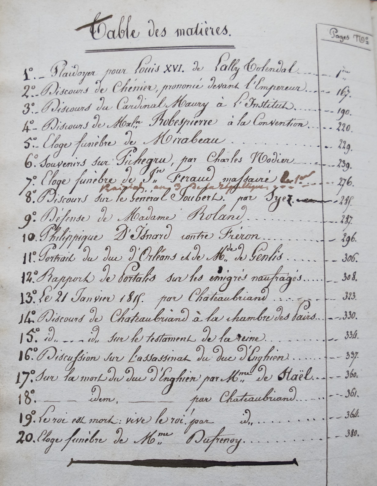 In seinem "Recueil de Pièces intéressantes" sammelte er folgende Essays, die er in einem hs. Inhaltsverzeichnis am Anfang erschließt: "1. Plaidoyer pour Louis XVI. du Comte de Lally Tollendal", "4. Discours de Monsieur Robespierre à la Convention", "5. Eloge funèbre de Mirabeau", "8. Discours sur le Général Joubert", "9. Défense de Madama Roland", "10. Philippique de Maximin Isnard représentant du peuple, Memre du Conseil du cinq cents contre Fréron expresentante du peuple", "11. Portrait du duc d'Orléans", "12. Rapport de Portalis sur les émigrés naufragés", "14. Discours de Chateaubriand à la chambre des Pairs", "16. Discussion sur l'assasinat du duc d'Enhien par Mme. de Stael" etc. etc. – Bemerkenswert frisch und sauber, wohlerhalten und sehr gut lesbar. Kaum Gebrauchsspuren oder Flecke. Titel mit hs. "Ex libris" von 1899 in roter Tinte.