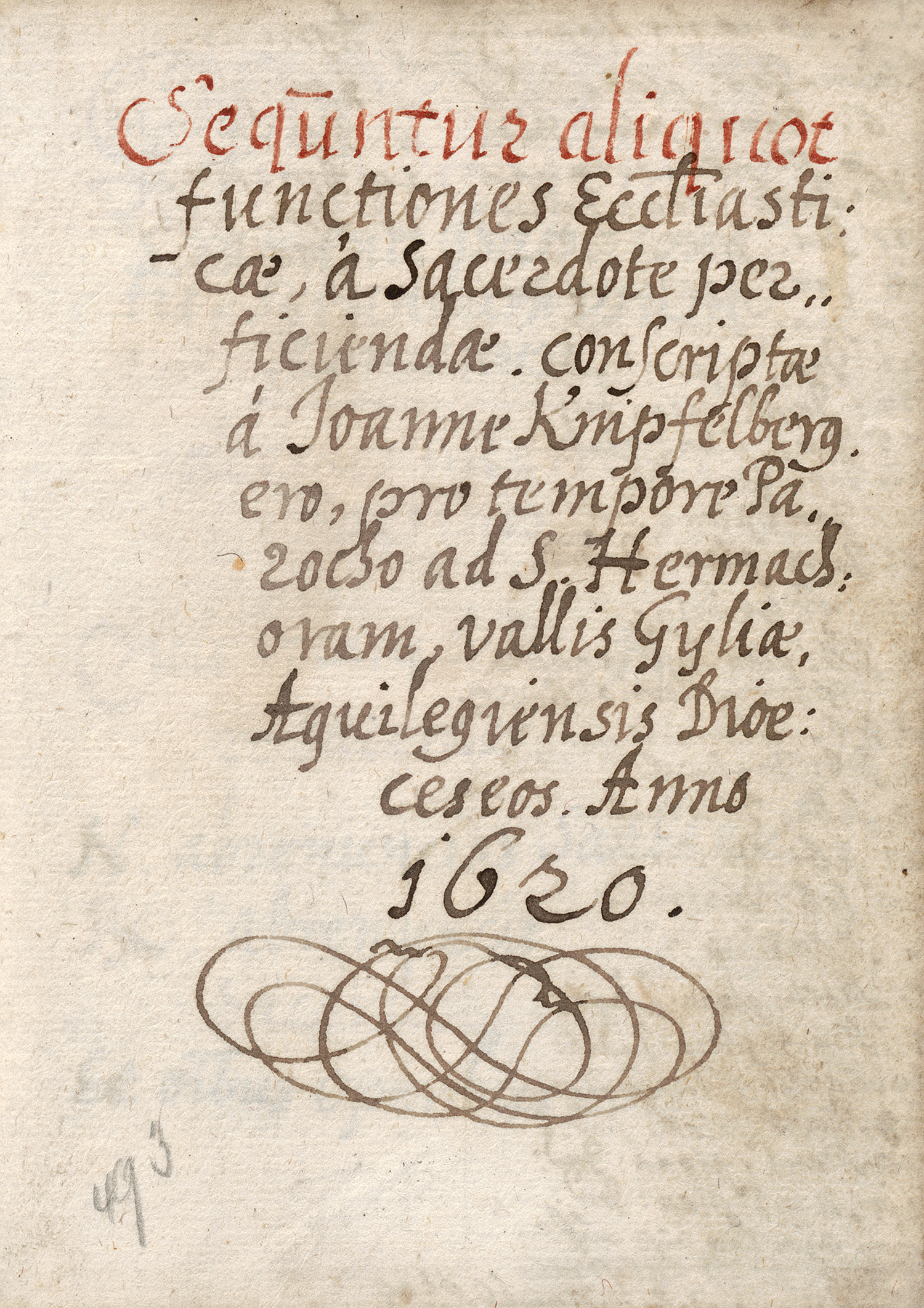 Vademecum eines Priesters der katholischen Kirche in der Diözese Aquileia aus Hermagor im Gailtal. Westlich von Villach, nicht weit der Grenze zu Slowenien, am Hermagor-Pressegger See in Kärnten gelegen, erhielt die Stadt ihren Namen von dem frühchristlichen Heiligen Hermagoras, des ersten Bischofs von Aquileia, der unter Diocletian sein Martyrium erlitt. Das Incipit hebt an: "Sequuntur aliquot functiones Ecclesiasticae, à Sacerdote perficiendae conscriptae à Joanne Knipfelbergero, pro tempore Parocho ad S. Hermagoram, vallis Gyliae Aquilegiensis Dioceseos. Anno 1620".