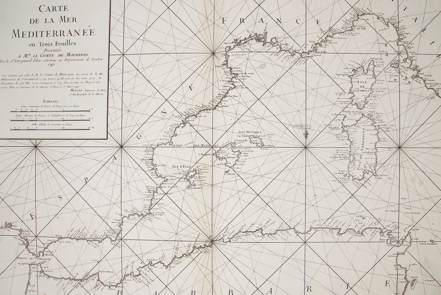 Groignard, Arnaud. Carte de la mer mediterranée en trois feuilles. 3 Kupferstichkarten. 55,5 x 77,5 cm (Plattenrand) bzw. 63 x 91,5 cm (Blatt). Paris 1745.