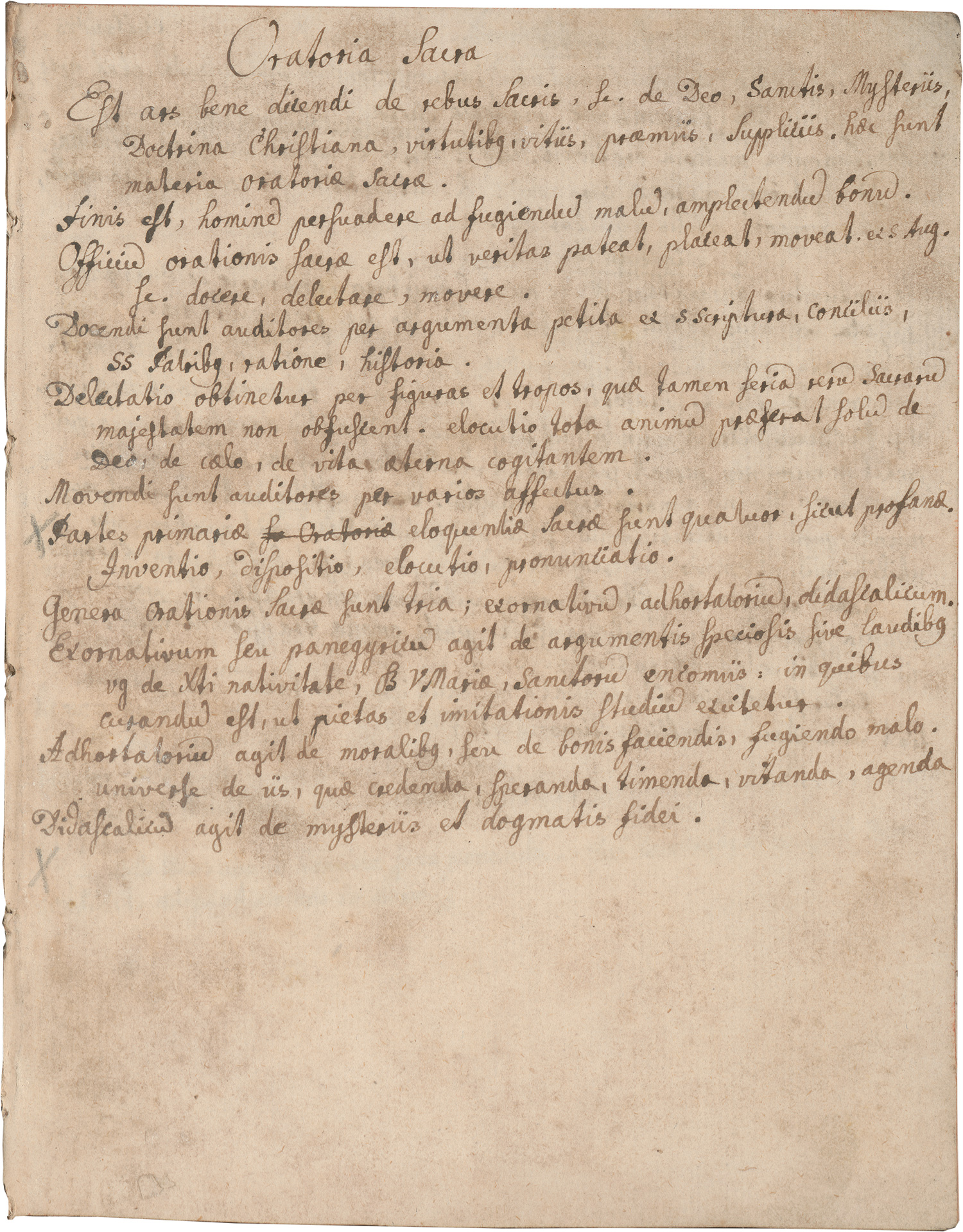 Oratoria Sacra. Lateinische und deutsche Predigthandschrift auf Papier. 198 Bl. Ca. 24-28 Zeilen. Schrift: deutsche und lateinische Kurrent. Format: 20,2 x 16 cm. Halbleder d. Z. (minimal beschabt) mit Kibitzbezugspapier. Österreich (Kloster Admont?) um 1780.