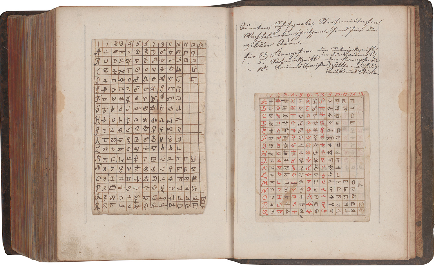 Mohr, Anton. "Bienenstock. In Welchem aus verschiedener Medicorum und und Chyrurgorum Manuscriptis [...]". Deutsche Handschrift auf Papier. 5 nn. Bl., 1472 S., 14 nn. Bl. Meist einheitliche, saubere Kurrentschrift in Sepia-Schwarz mit Auszeichnungen in Rot sowie 1 eingeschriebene und 3 einmontierte Tabellen der "Chymischen Zeichen" (eine gedruckt, zwei hs.). 24 x 17 cm. Dunkelbraun-schwarzes Leder d. Z. (teils etwas brüchig, beschabt, bestoßen und berieben, jedoch sauber restauriert) über 5 Bünden und mit dreiseitigem Rotschnitt. Wien 1799.