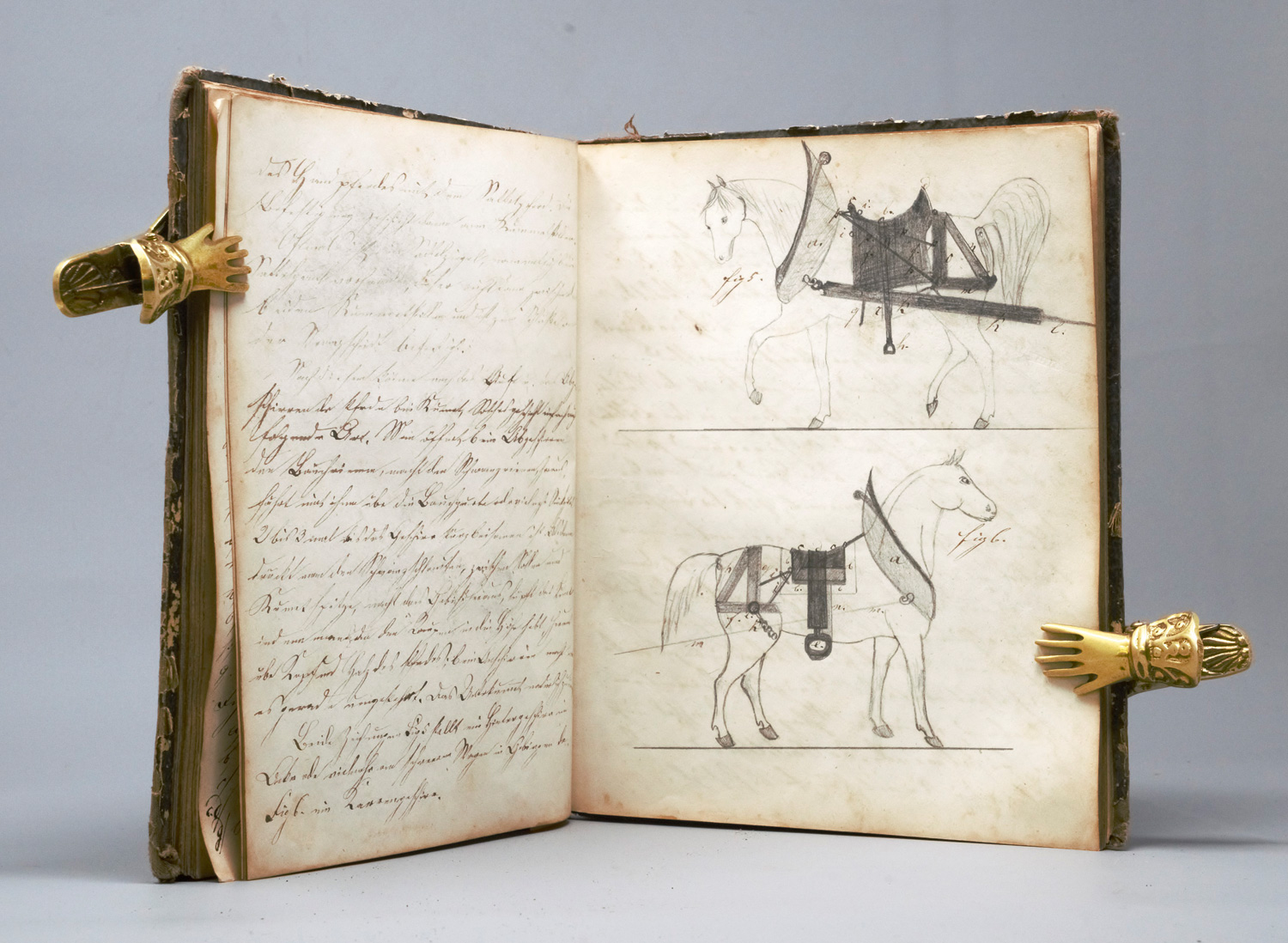 Hadrian, Carl. "Tagebuch geführt auf Hochburg. Hadrian Carl aus Baden." Deutsche Handschrift zur Landwirtschaft auf Papier. 94 Bl. 16-21 Zeilen. Mit schwarzbrauner Feder in Kurrent-Kursiva. Schriftraum: ca. 18 x 15,5 cm. Format: 20,5 x 16,5 cm. Mit 8 Bleistiftzeichnungen von Pferden und landwirtschaftlichen Geräten im Text. Halbleinen d. Z. (Außengelenke abgeplatzt, stärker berieben und bestoßen). Hochburg bei Emmendingen 1854.