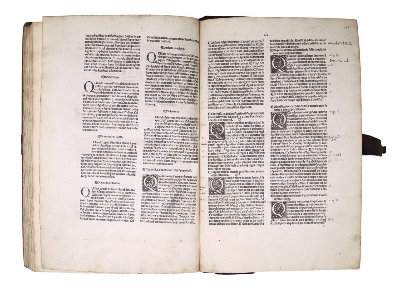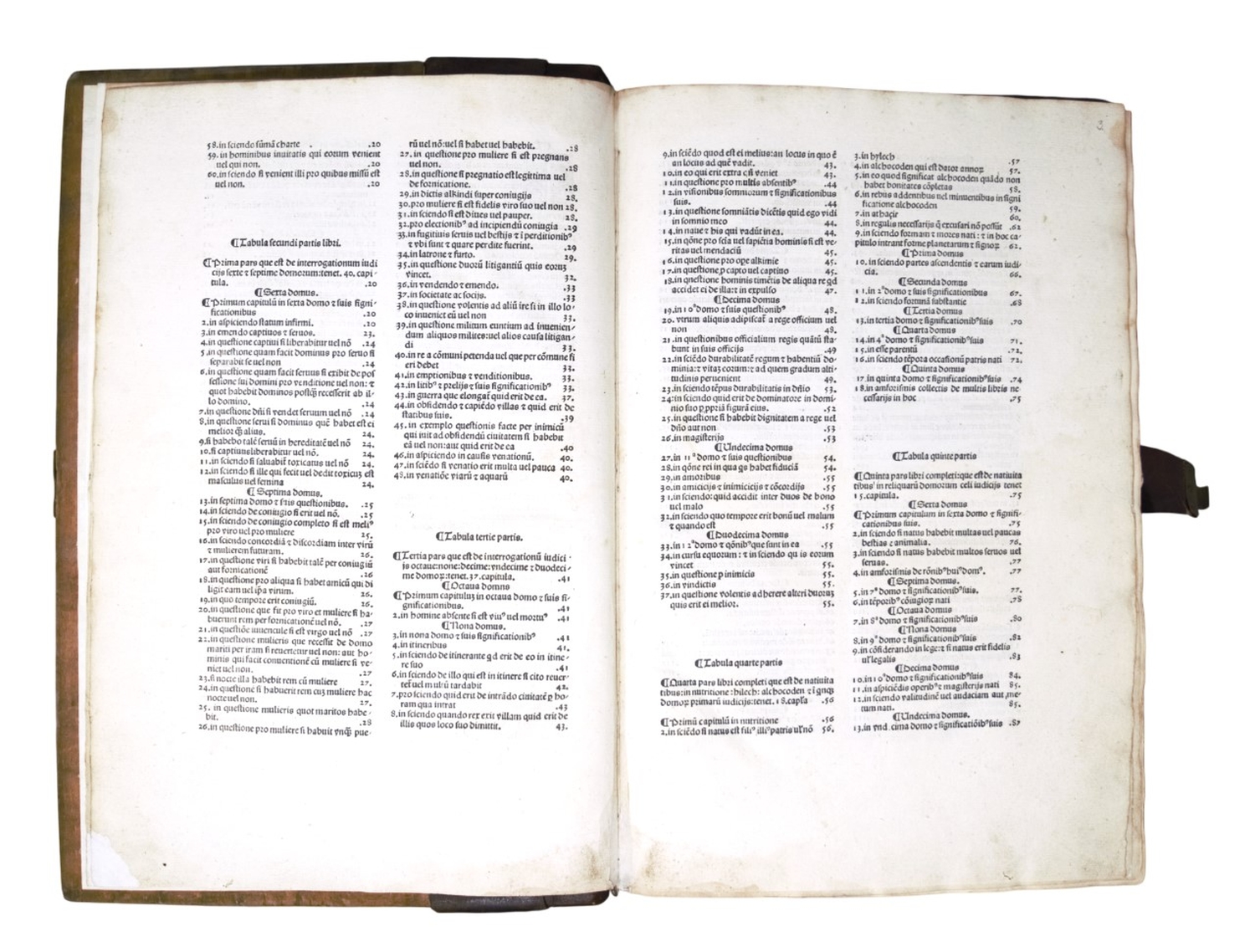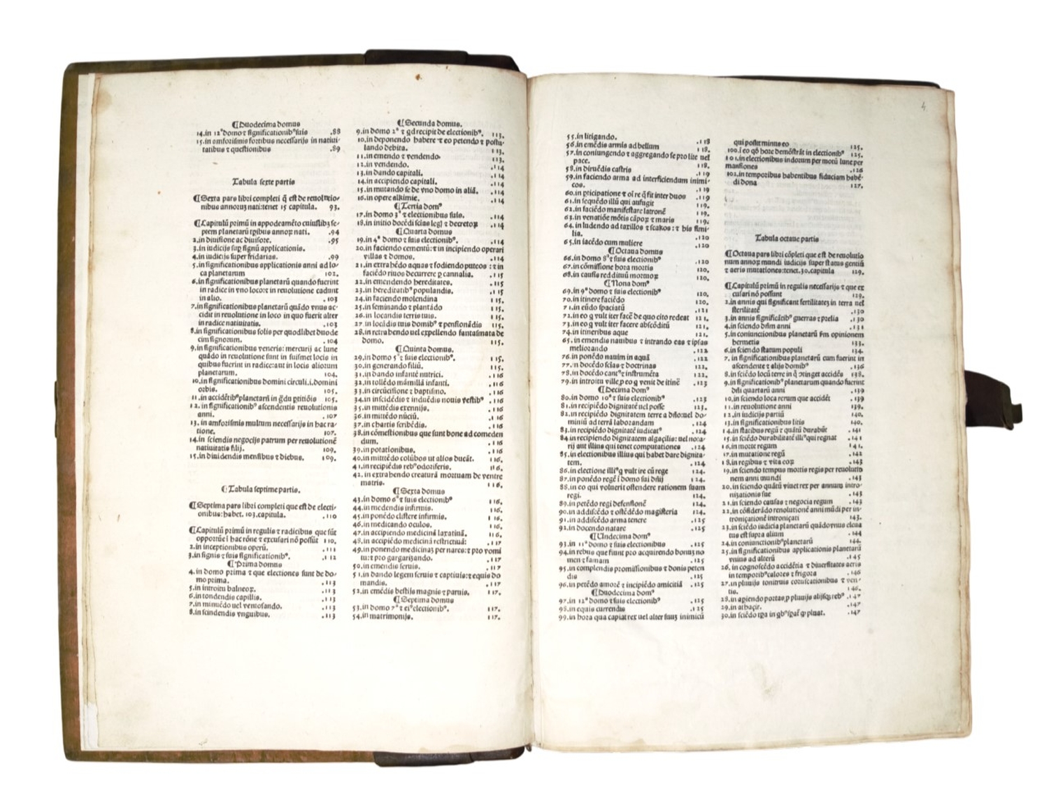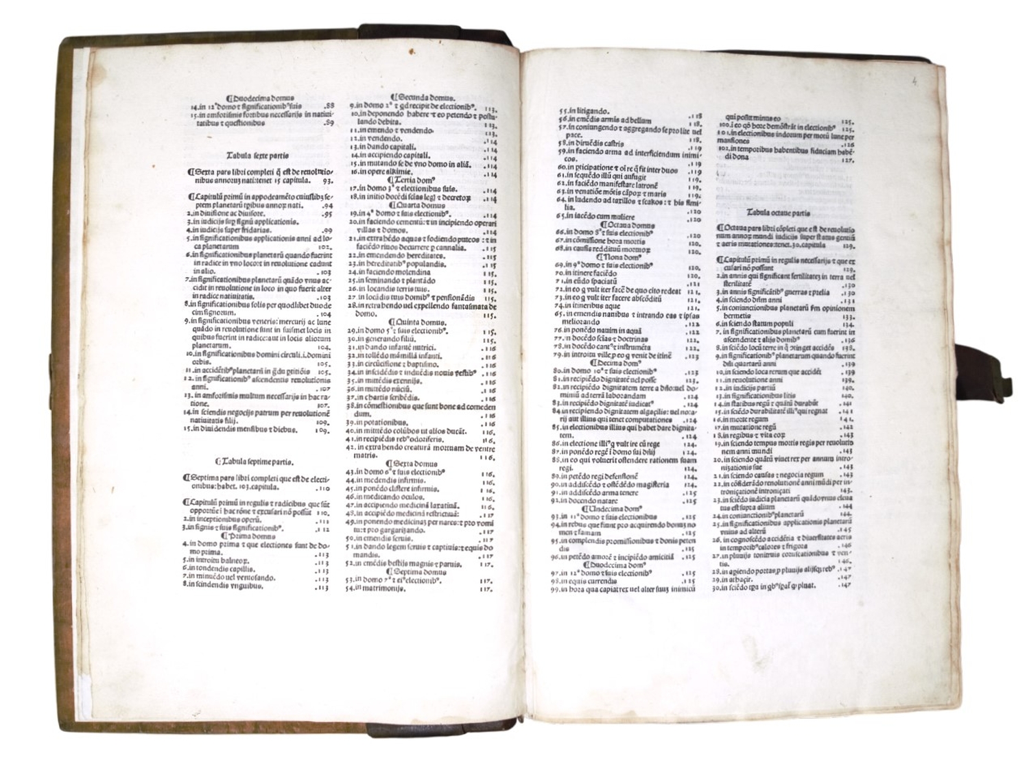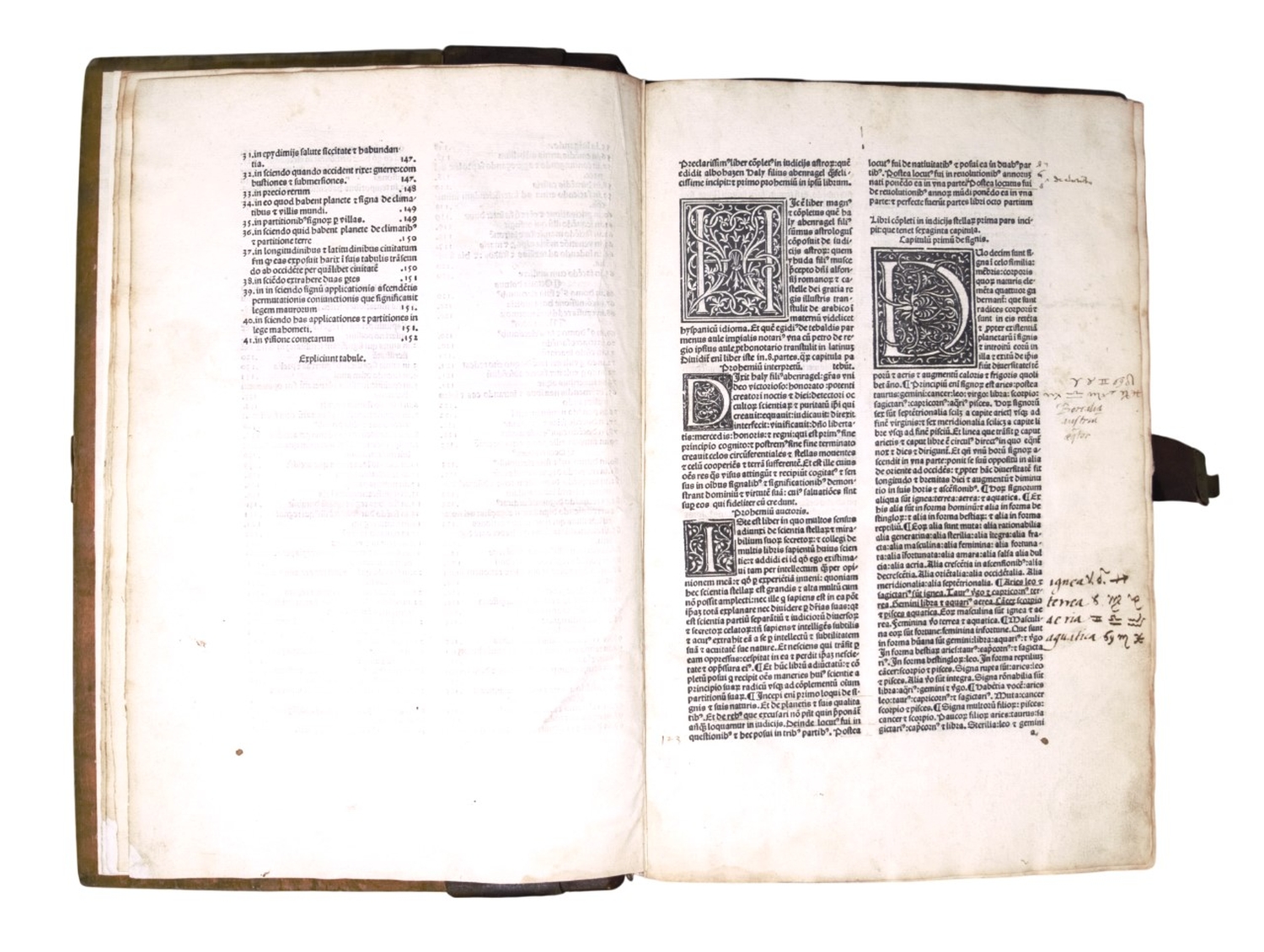 Haly filius Abenragel (Albohazen). Liber de judiciis astrorum. Übersetzt von Aegidius de Tebaldis und Petrus de Regio, hrsg. von Bartholomaeus Alten. 4 nn., 152 num. Bl. 2 Spalten. 60 Zeilen. Got. Typ. Schriftraum: 22,9 x 14,5 cm. Format: 31,5 x 21,5 cm. Mit 1 schematischen Textholzschnitt und zahlreichen 4-13-zeiligen Holzschnitt-Initialen. Holzdeckelband d. Z. (neu aufgebunden, Vorsätze erneuert) mit breitem blindgeprägten Lederrücken (nur die breiten Lederstücken auf den Deckeln vollständig vorhanden, der weitgehend fehlende Rücken mit Kalbsleder unterlegt, kleines Stück des blindgeprägten Leder d. Z. aufmontiert) mit dreiteiliger Messingschließe (Schließband erneuert). Venedig, Erhard Ratdolt, 4.VII.1485.