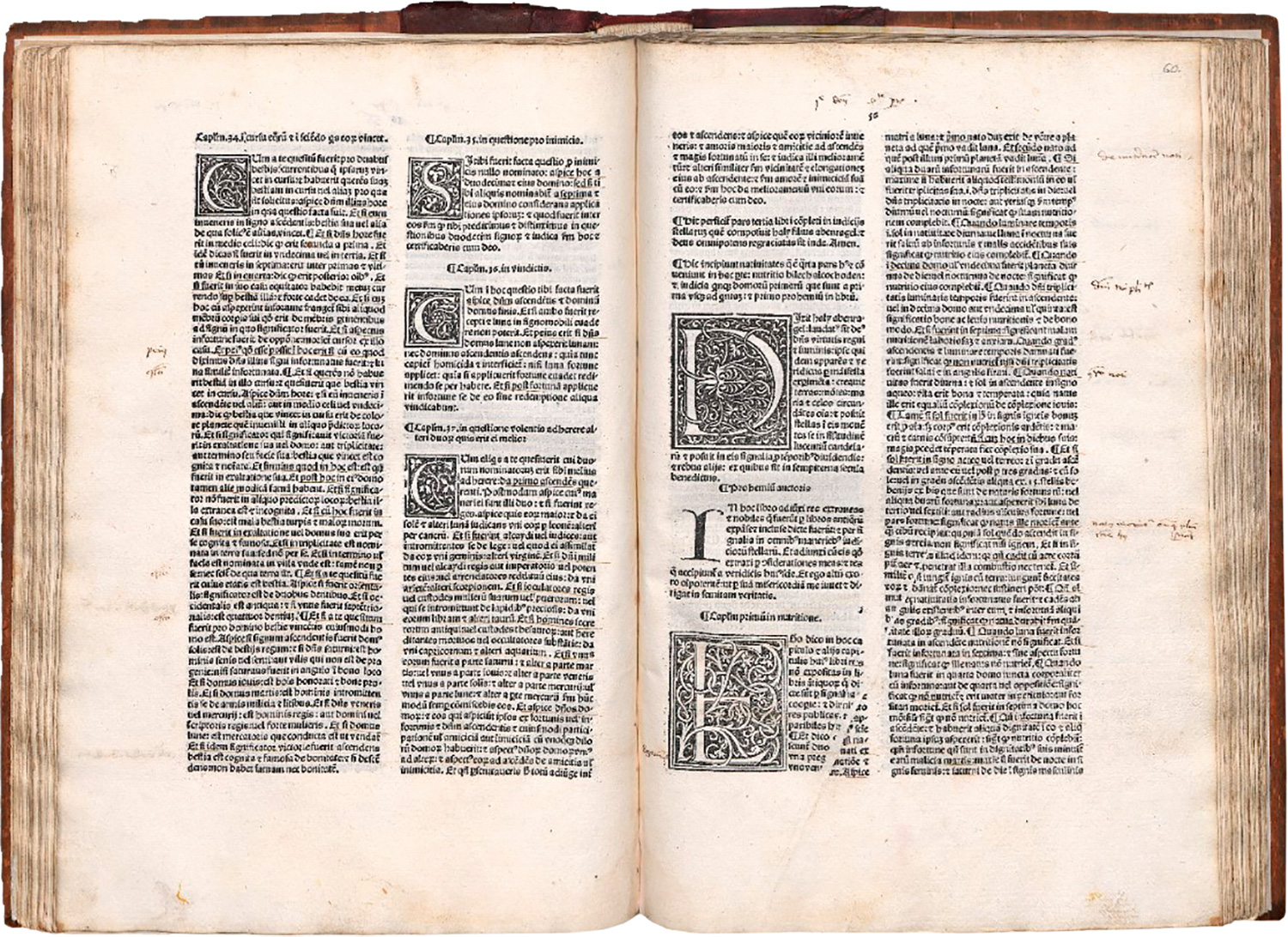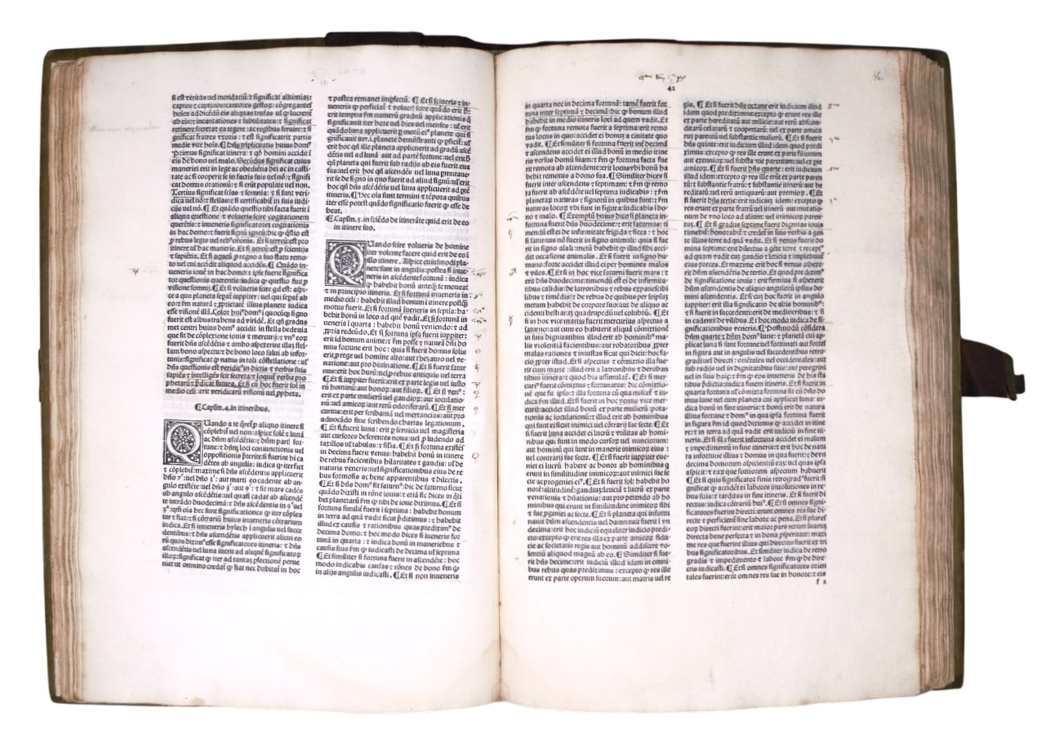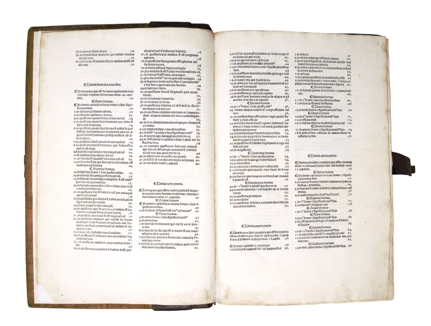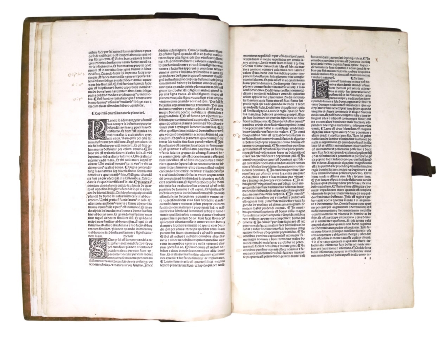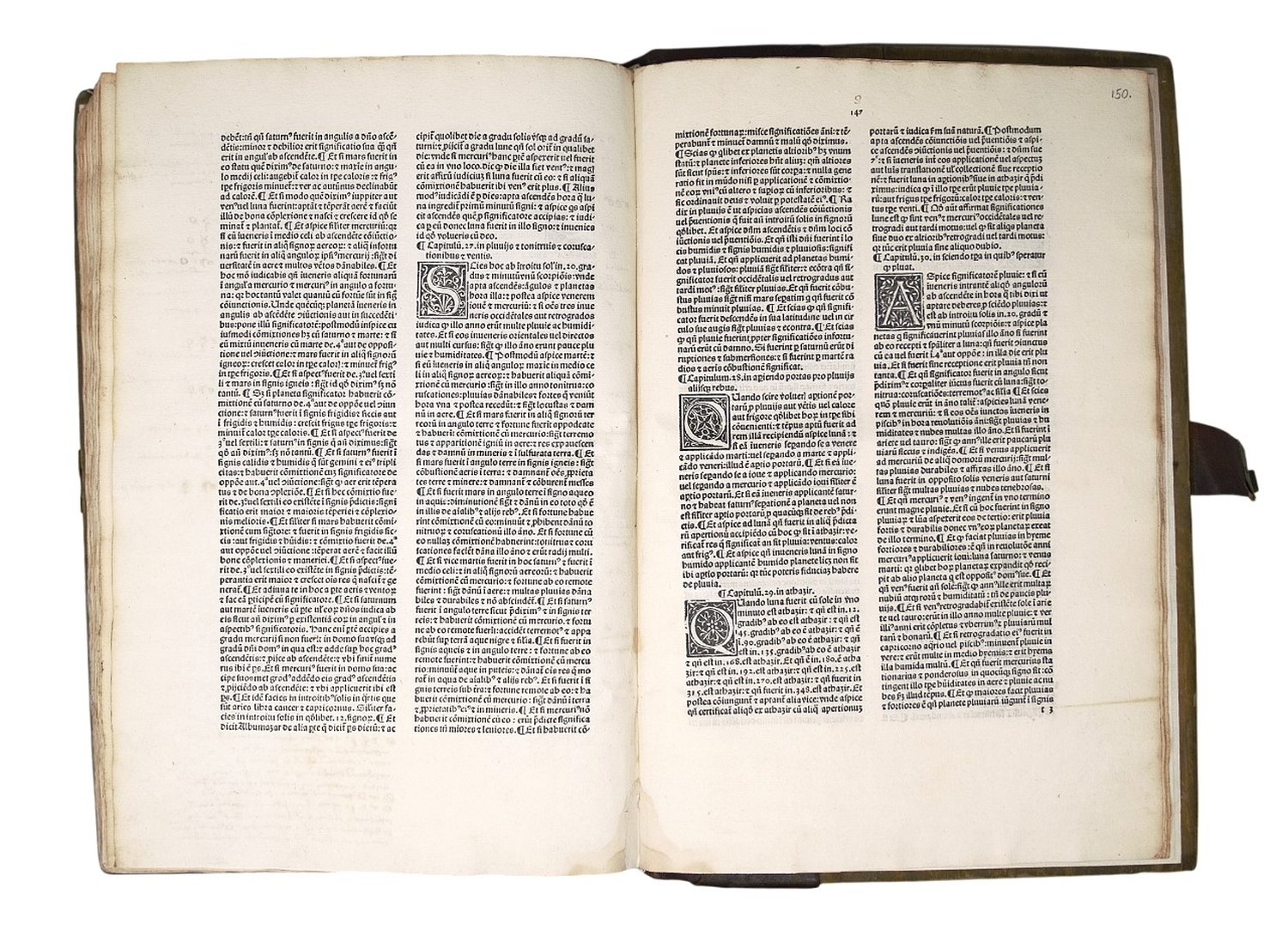 Haly filius Abenragel (Albohazen). Liber de judiciis astrorum. Übersetzt von Aegidius de Tebaldis und Petrus de Regio, hrsg. von Bartholomaeus Alten. 4 nn., 152 num. Bl. 2 Spalten. 60 Zeilen. Got. Typ. Schriftraum: 22,9 x 14,5 cm. Format: 31,5 x 21,5 cm. Mit 1 schematischen Textholzschnitt und zahlreichen 4-13-zeiligen Holzschnitt-Initialen. Holzdeckelband d. Z. (neu aufgebunden, Vorsätze erneuert) mit breitem blindgeprägten Lederrücken (nur die breiten Lederstücken auf den Deckeln vollständig vorhanden, der weitgehend fehlende Rücken mit Kalbsleder unterlegt, kleines Stück des blindgeprägten Leder d. Z. aufmontiert) mit dreiteiliger Messingschließe (Schließband erneuert). Venedig, Erhard Ratdolt, 4.VII.1485.