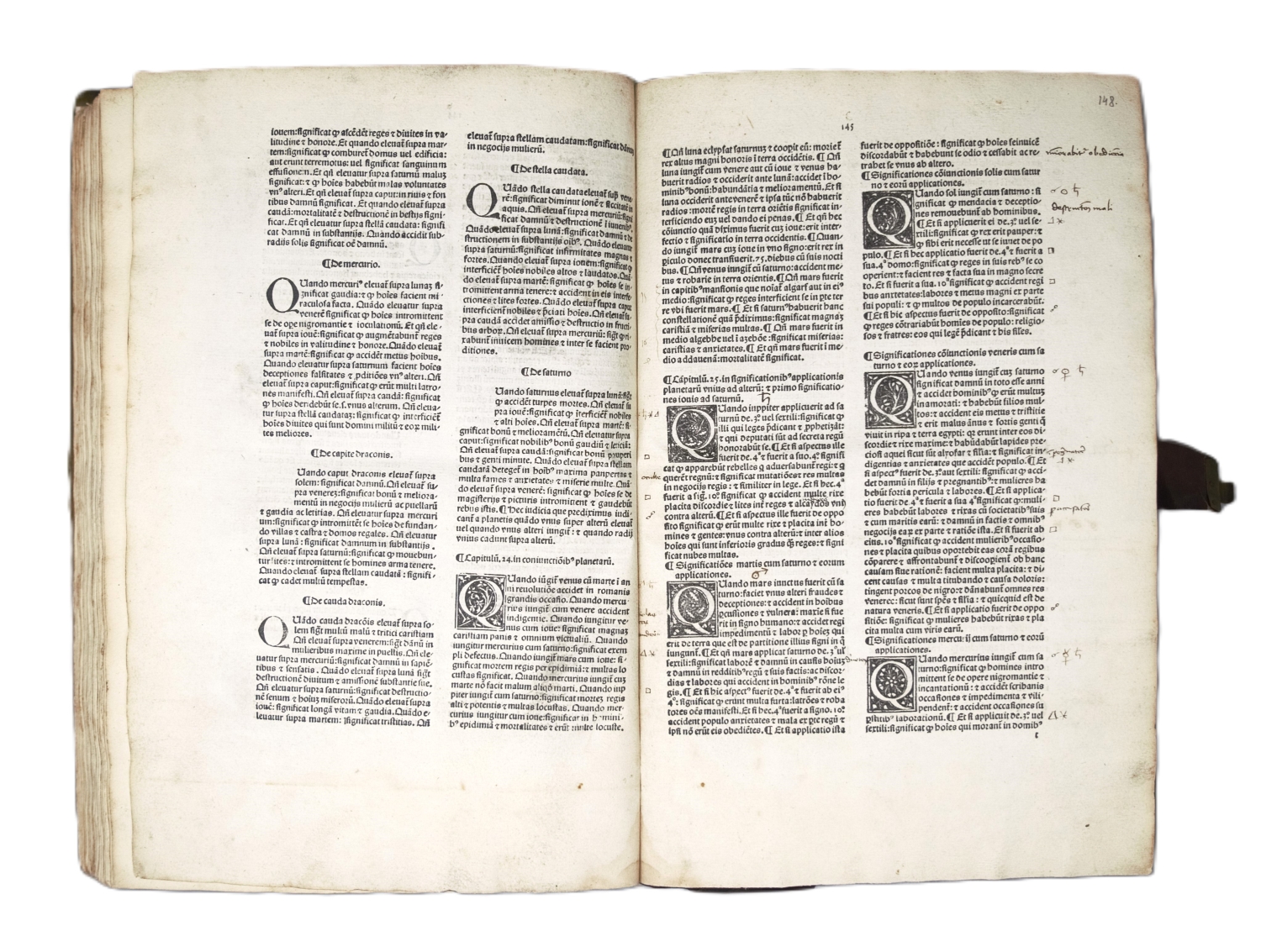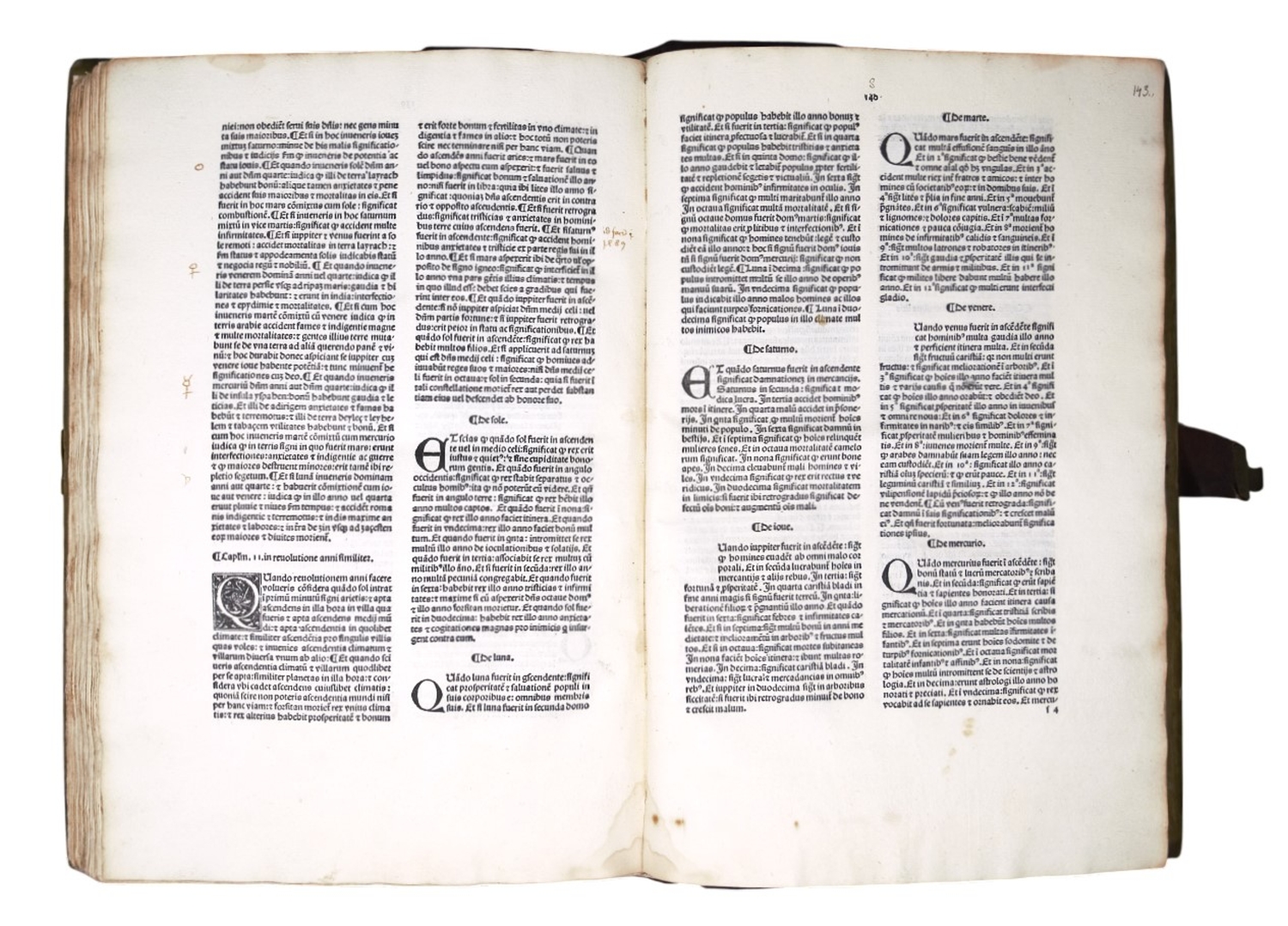 Hain-Copinger 8349. GW 12117. Goff H-4. Proctor 4403. Pellechet 5696. Klebs 35.1. Badalić 520. Bodleian H-002. Borm 1274. Collijn 509. Collijn. Günther 3607. Hubay 1002. 2906. Madsen 1898. Nentwig 199. Oates 1763. 1764. Ohly-Sack 1385-1387. Sack 1763. Scheidegger-Tammaro 691. Walsh 1829. BMC V, 290. BSB-Ink A-1. CIBN H-2. ISTC ih00004000. – Erste Ausgabe der lateinischen Übersetzung eines der weitverbreitetsten astrologischen Handbücher der Zeit, das sowohl in der arabischen wie europäischen Welt beliebt war. Autor ist Abû 'l-Hasan 'Ali ibn, kurz Haly Abenragel (10.-11. Jahrhundert n.Chr. bzs. 4.-5. Jahrhundert der arabischen Zeitrechnung nach der Hidschra), der als Hofastrologe des Prinzen Al-Mu'izz ibn Bâdis in Tunesien tätig war und die Sternkonstellationen und deren Wirkung auf den Menschen erforschte. "[Il] vivait vers le commencement du onzième siècle de Jesus-Christ, sous le khalife Mamoun. Son livre, très-rare, De Judiciis seu fatis stellarum, a été traduit en latin et publié à Bâle par Henri Petri, et à Venise, en 1485, par Erhard Radelez." (Hoefer I, 115). Die Basel-Ausgabe ist jedoch nicht nachweisbar, es handelt sich wohl um einen Irrtum bei Hoefer.