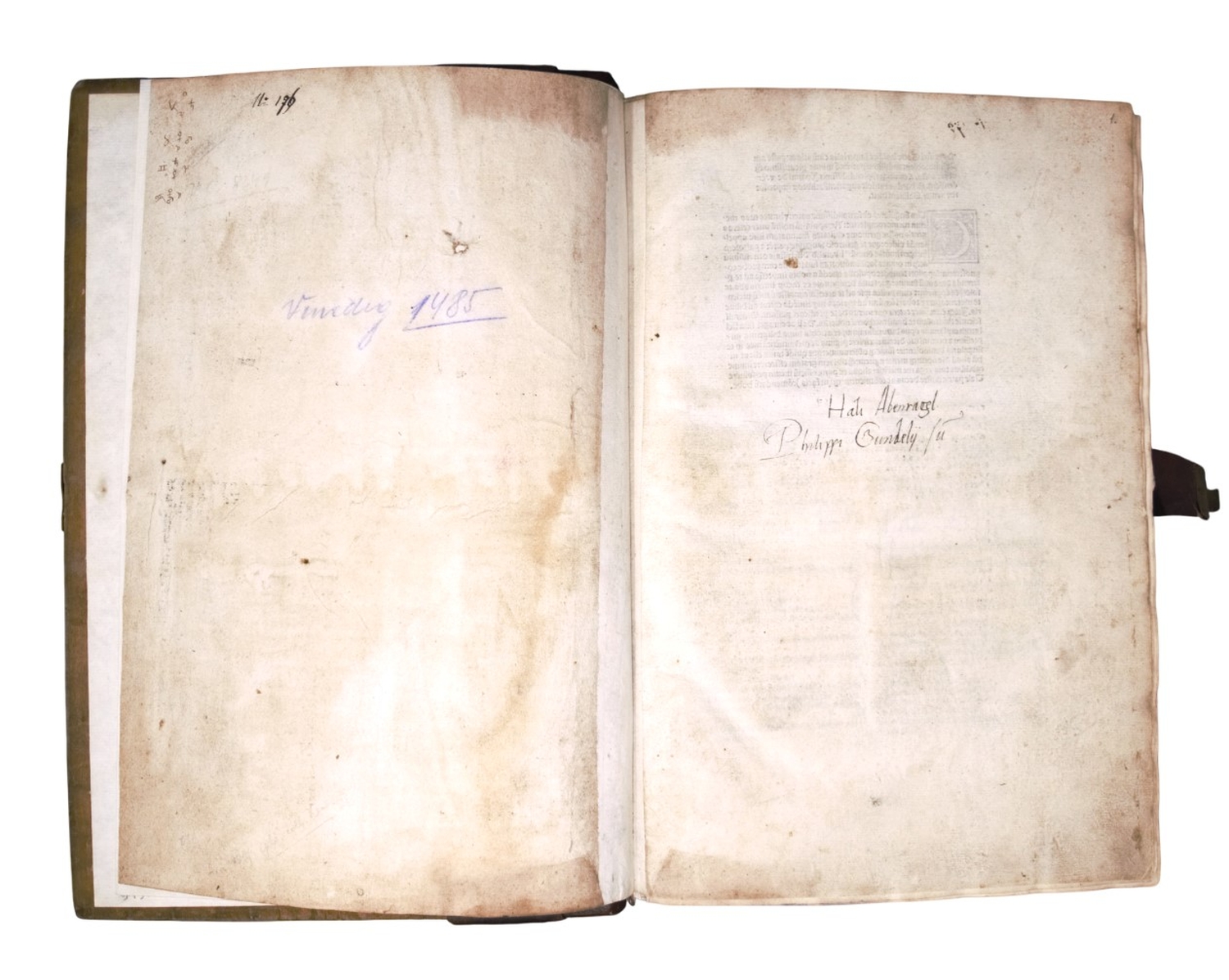 "Fort rare [...]. On prétend que Kepler a tiré de cet ouvrage d'importantes indications" (Houzeau-Lancaster). Zum Verfasser siehe V. Stegemann, Beitr. z. Gesch. d. Astrologie I (Heidelb. 1935): Der arab. Astrologe Abu 'l-Hasan `Ali ibn abi'r-Rigal, gen. Albohazen, sowie Carmody 150f. u. F. Sezgin, Gesch. d. arab. Schrifttums VII, 186f. – Im oberen und unteren Rand sowie im Bug teils leicht wasserfleckig, stellenweise minimal wurmstichig, einige Blätter am Anfang und am Schluss im Bug verstärkt, die 4 Blätter der ersten Lage beim Restaurieren wenige Millimeter zu hoch eingehängt, Blatt 1 mit angesetztem Eckchen und altem Besitzvermerk eines Philipp Gundelius, num. Bl. 33 mit geklebtem Einriss, sonst wohlerhaltenes, vollständiges Exemplar, breitrandig und mit Marginalien von alter Hand, Rücken unter Verwendung des alten Bezugs erneuert, Schließband und Vorsatz ebenfalls erneuert. - Exlibris "Philosophia Hermetica" (Bibliotheca Philosophica Hermetica J. R. Ritman, Amsterdam).