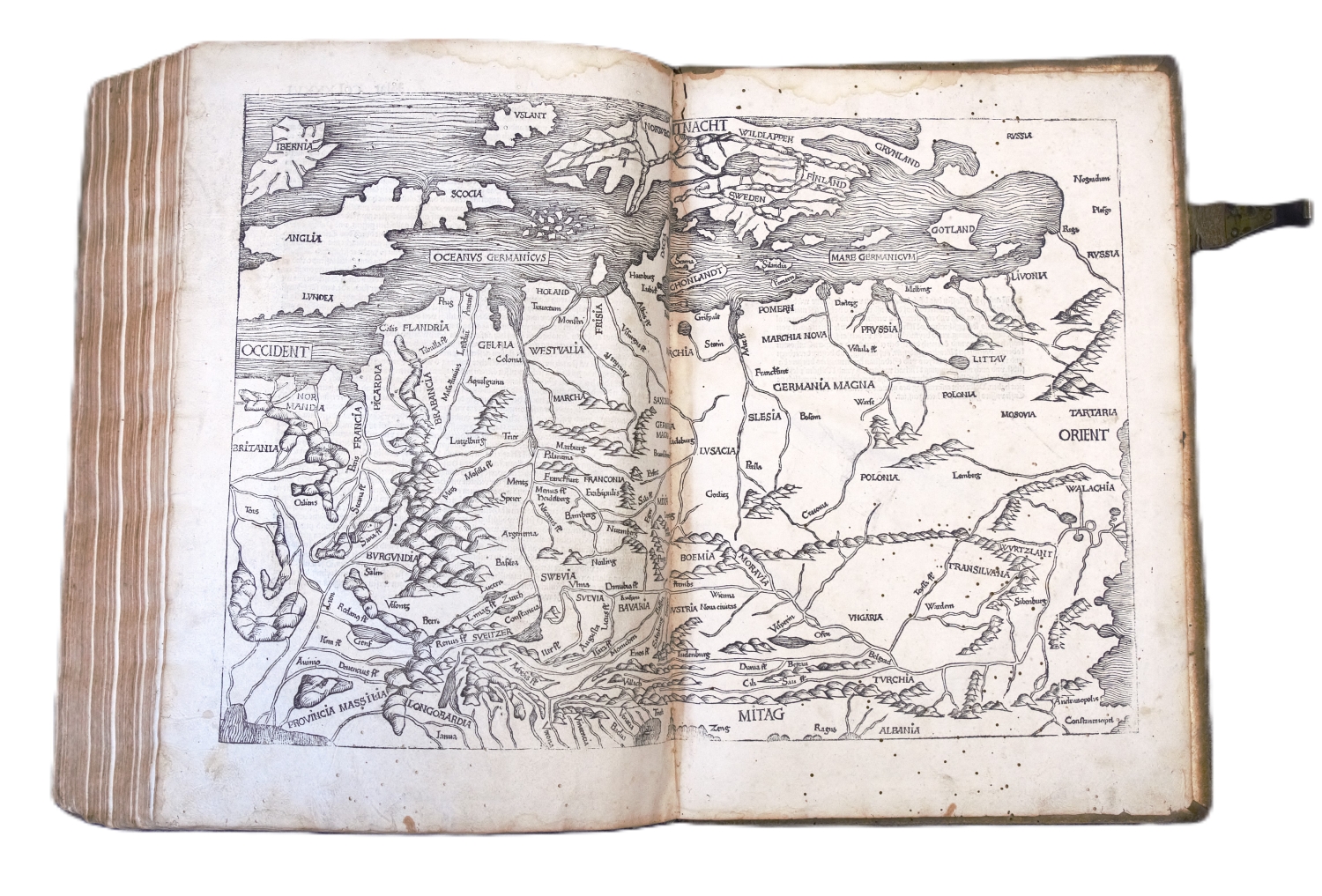 Hain 14510. GW 40796. Goff S-309. Proctor 2086. Pellechet 10354. Klebs 890.1. Schreiber 5205. Schramm XVII, 408-576. Bodleian S-110 Borm 2414. Bornatico 12. Collijn 966. Finger 870. 871. Günther 2071. Hubay 1861. Hummel-Wilhelmi 637. Schäfer 310. Kind 809. 810. Madsen 3637. Schlechter-Ries 1615-1619. Ohly-Sack 2530-2532. Raffel 438. Riedl 904. 905. Sack 3184. Sallander 1337b. Scheidegger-Tammaro 1206. Sheehan S-134. Voullième 1096. Walsh 734. 735. CBB 3471. CIH 3041. IBE 5181. IDL 4062. IGI 8830. BMC II, 437. BSB-Ink S-197 CIBN S-163. ISTC is00309000. – Erste deutsche Ausgabe des "Liber chronicarum", der berühmten Weltchronik des Nürnberger Humanisten, Historikers und Arztes Hartmann Schedel (1440-1514), die ein halbes Jahr nach der lateinischen Originalausgabe erschienen war. Es war das "größte Buchunternehmen der Zeit" (Rücker) und gehört zu den am umfangreichsten illustrierten Inkunabeln überhaupt. Die dafür verpflichteten Künstler Michael Wohlgemuth (1434-1519) und sein Schwiegersohn Wilhelm Pleydenwurff (1460-1494) kamen aus derselben Nürnberger Werkstatt, in der auch Albrecht Dürer ausgebildet worden war.