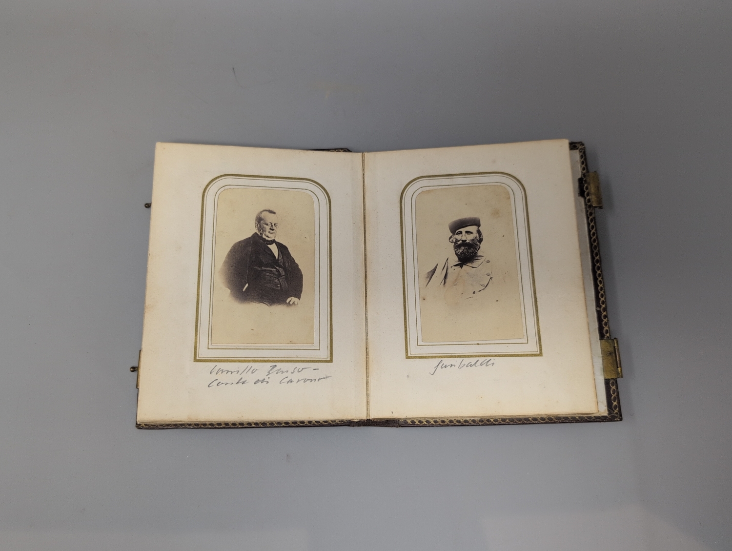 Italienisches Porträtalbum des Risorgimento. Fotoalbum mit 20 Porträtfotografien. Albumin-Abzüge im Carte-de-Visite-Format auf 10 Blatt festem Karton montiert.14,3 x 11 cm. Blindgeprägtes Leder d. Z. (an den Kapitalen gering berieben) mit 2 Metallschließen sowie Goldschnitt und Innenkantenvergoldung. Wohl Florenz 1866.