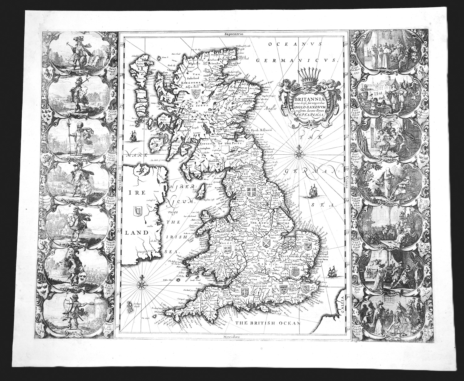 Eine Kupferkarte Großbritanniens aus dem historischen Atlas von Georg Horn (1620-1670) Hornius Accuratissima Orbis antiqui delineatio und gestochen von Johann Janssonius (1588-1664). Die Karte zeigt Britannien mit den angelsächsischen Reichen mittels Wappen, Grenzen, Legende und mit 14 seitlichen Randdarstellungen in Rocaillekartuschen. Diese seitlichen Miniaturdarstellungen repräsentieren die einzelnen Gebiete "Kent", "East Saxon", "East Angle", "Northumberland", "West Saxon", "Mercia" und "South Saxon" mit ihren jeweiligen Wappen und Personifikationen.