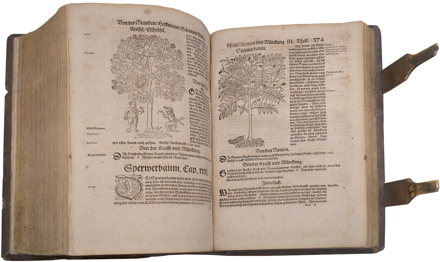 Bock, Hieronymus. Kreütterbuch, Darin underscheidt Nammen und Würckung Kreütter, Stauden, Hecken und Bäumen, mit ihren Früchten, so in Teutschen Landen wachsen ... gemehret, durch ... Melchiorem Sebizium. 36 nn., 470 num., 24 nn. Bl. Mit Holzschnitt-Portrait, ganzseitigen Holzschnittwappen sowie über 500 Pflanzenholzschnitten, inklusive einiger figürlicher Holzschnitte. 33,5 x 21 cm. Braunes Kalbsleder (Rücken restauriert unter Verwendung des Rückens d. Z., insgesamt etwas berieben und bestoßen) mit mehreren blindgeprägten DBordüren sowie zwei restaurierte Messingschließen. Straßburg, Josias Rihel, 1595.