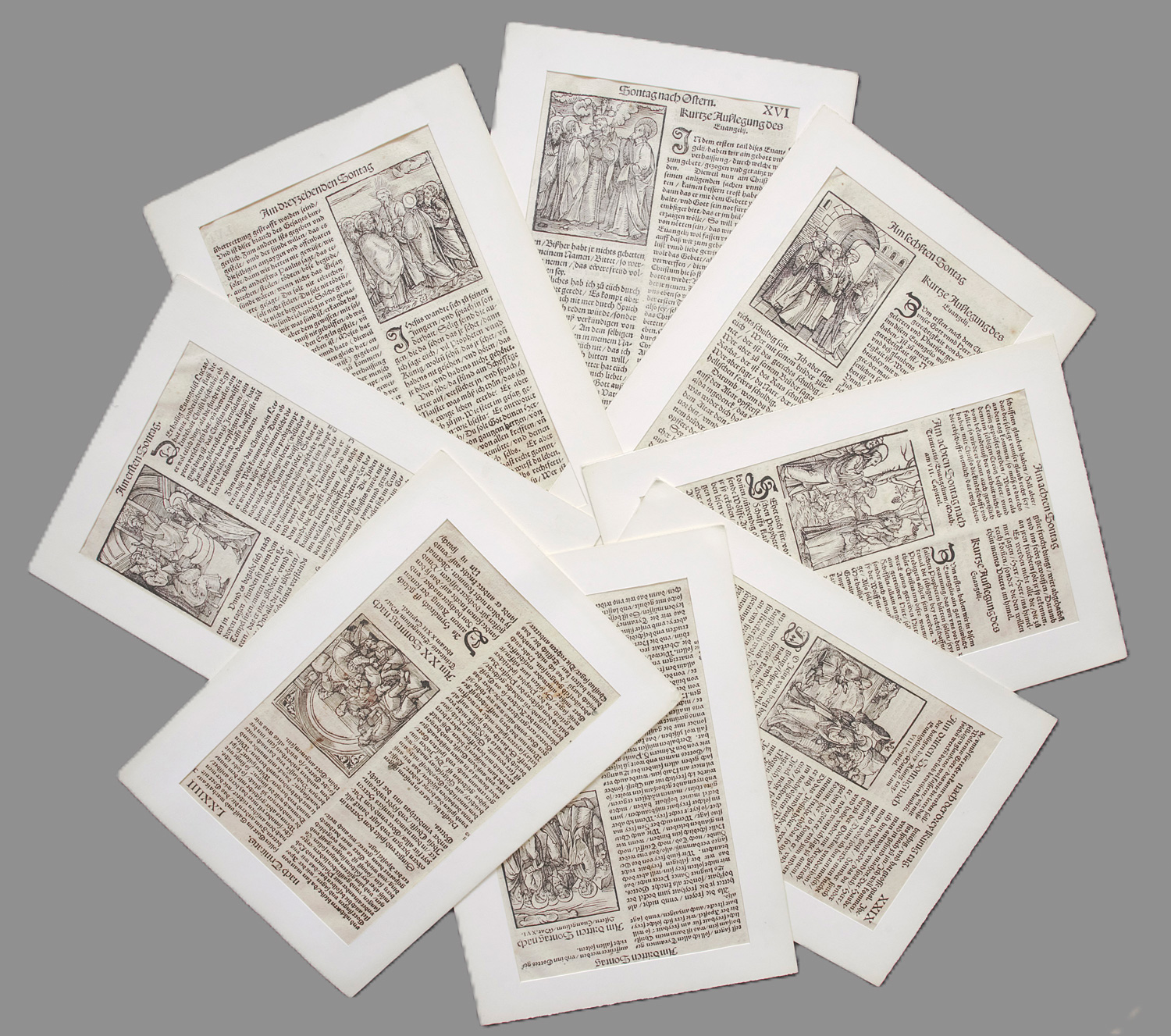 Buchholzschnitte der Frühdruckzeit. 10 Einzelblätter aus verschiedenen Frühdrucken des 16. Jahrhunderts mit 10 figürlichen und szenischen Textholzschnitten mit biblischen Darstellungen. Davon 8 unter Passepartout. 30,5 x 21 cm. Deutschland 16. Jahrhundert.