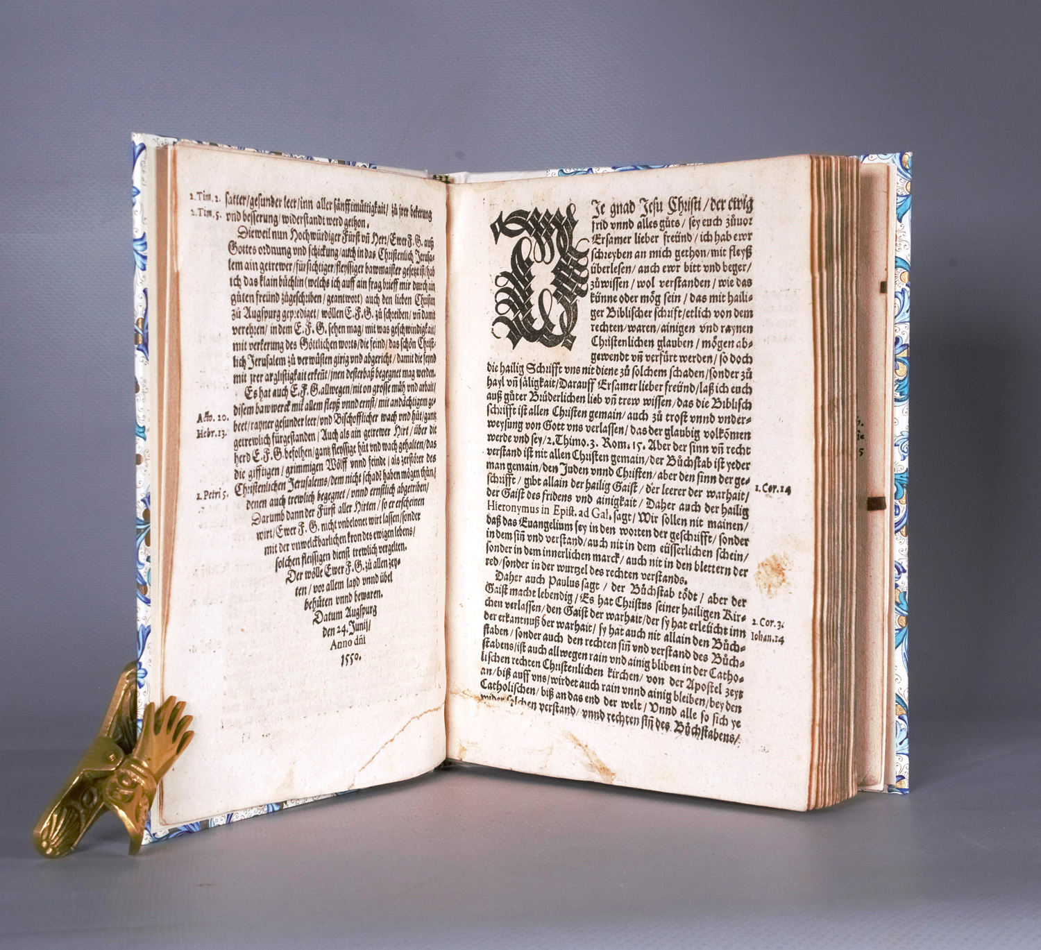 Fabri, Johann. Auff die Frag, ob die hailig bilbisch Schrifft, könne und mög zu schade des Menschen gebraucht werden. Dieweil dy allain zu gutem trost und hayl des Menschen verlassen. 34 S. Mit großer 19-zeiliger Holzschnitt-Initiale. 18,5 x 14 cm. Modernes Halbpergament mit goldgeprägtem DTitel und goldgeprägtem Brokat-Papier auf den Deckeln. Augsburg, Philipp Ulhart, o. J. (1550).