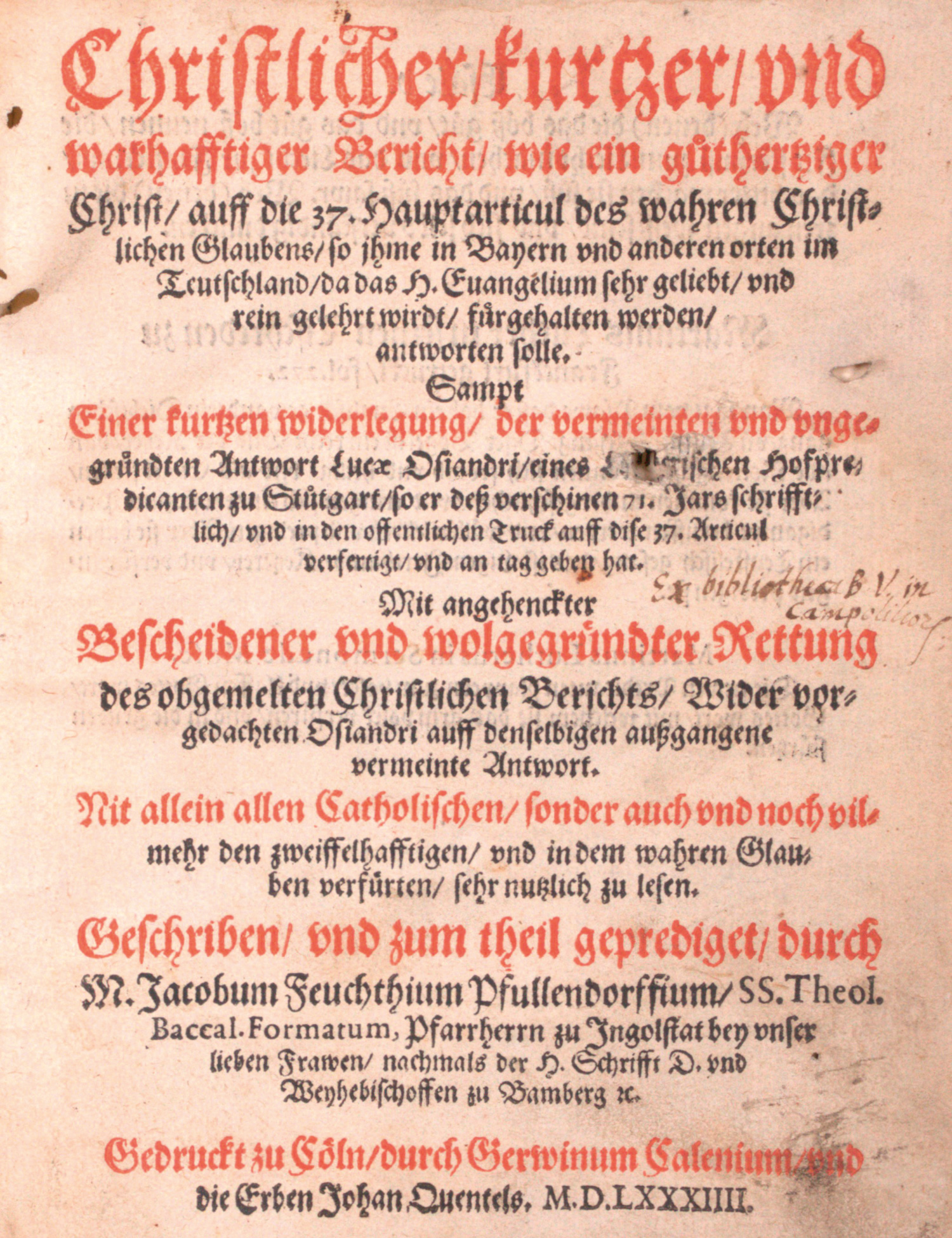 VD16 F 831. – Zweite, posthum erschienene Ausgabe, die der Ingolstädter Erstausgabe von 1572 folgte. Die "Widerlegung, der vermeinten und ungegründeten Antwort" auf Lucas Osianders und Martin Luthers Thesen macht deutlich, wie sich der Verfasser, der Titular- und Weihbischof Jakob Feucht (1540-1580), zwar für die Verteidigung der alten christlichen Lehre einsetzte, gleichzeitig aber auch die Reformbewegungen unterstützte. – Titel recto und verso mit zeitgenössischem Besitzeintrag in Sepia. Titel mit kleinem Löchlein (minimaler Buchstabenverlust), gering wurmspurig, leicht angeschmutzt. Etwas gebräunt und fleckig, teils mit nachgedunkelten Feuchtflecken im Rand.
