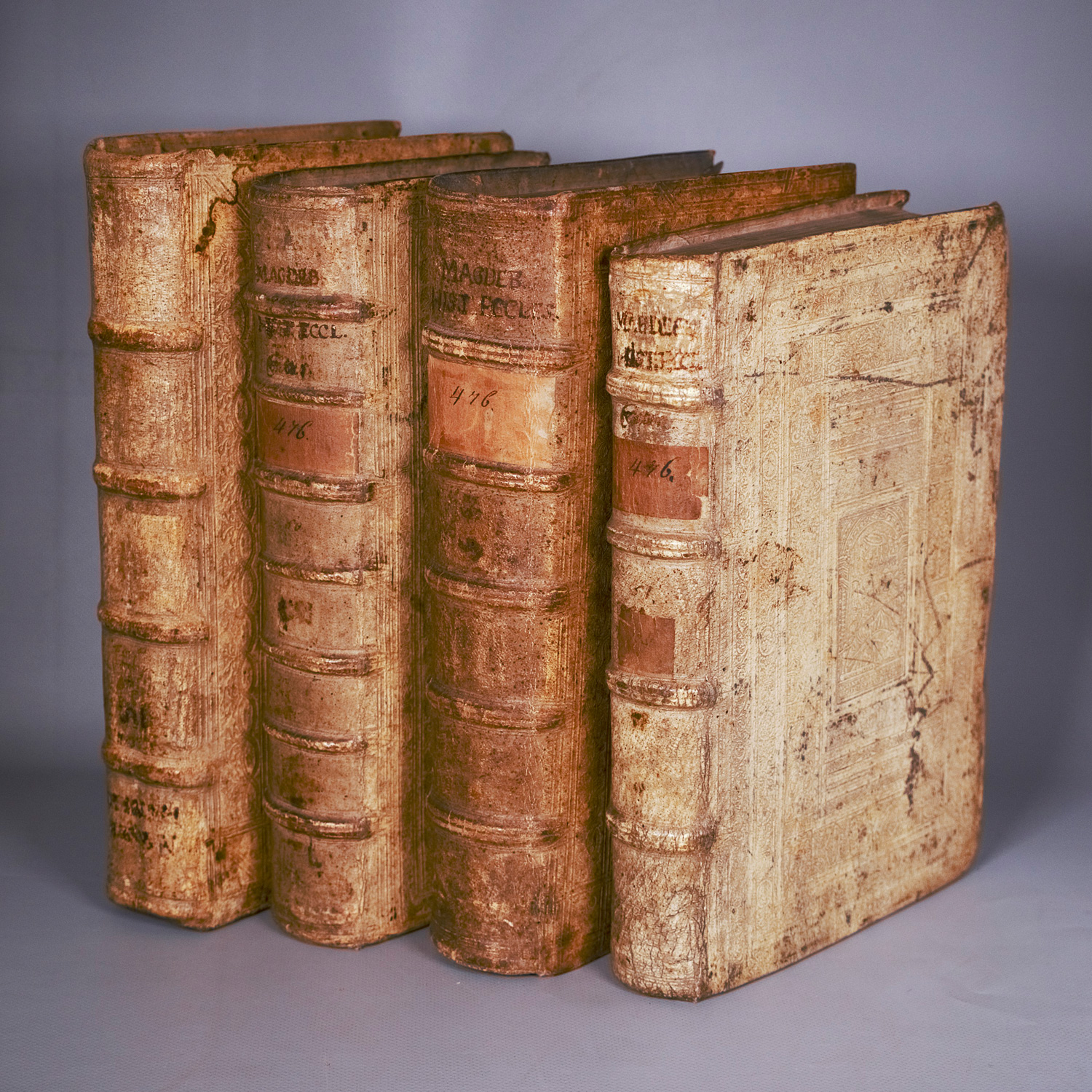 (Flacius, Matthias). Ecclesiastica historia. 6 Teile (I-IV, XII und XIII) in 4 Bänden. Folio. Verschiedene blindgeprägte Schweinslederbände d. Z. (stärker berieben, etwas fleckig, Ecken bestoßen). Basel, Johann Oporinus, 1559-1574.