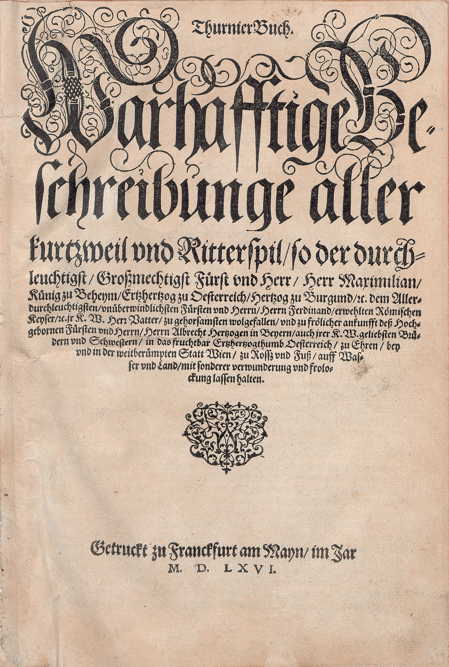 VD16 F 2208. Vgl. Graesse II, 629 ("Thurnier Buch Wahrhafftiger Ritterlicher Thaten, so in dem Monat Junii 1560 ...". Erste Ausgabe 1560-1561). Nicht im Adams und STC. – Zweite Ausgabe mit dem veränderten Titel "ThurnierBuch. Warhafftige Beschreibunge aller kurtzweil und Ritterspil, ..." statt "Thurnier Buch Wahrhafftiger Ritterlicher Thaten, so in dem Monat Junii 1560 ..."aus dem Jahre 1560-1561. Die zweite, hier vorliegende, Ausgabe wurde dem Werk von Georg Rüxner "ThurnierBuch. Von Anfang, Ursachen, Ursprung, und herkommen der Thurnier im heyligen römischen Reich Teutscher Nation ... " beigeben.