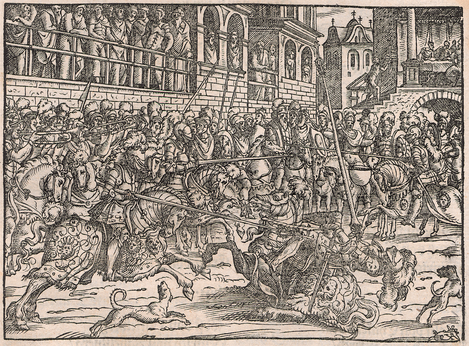 Der Autor Johann von Francolin (1520-1580) war ein Heraldiker und Herold des Königreichs Ungarn zurzeit Kaiser Ferdinand I. Er beschreibt im Vorliegenden Werk in Wort und mit spektakulären Bilder die Turniere, Schaukämpfe, Bälle und Bankette, die zu Ehren des Wienbesuchs Herzog Albrechts V. von Bayern, Schwiegersohn des Kaisers und Schwager des Königs von Böhmen, Maximilian II., abgehalten wurden, darunter auch eine aufwändig inszenierte Seeschlacht etc. Zudem arbeitete er zusammen mit Georg Rüxner (ca. 15.-16. Jh.) an dem bekannteren und verbreiteteren Werk "Anfang, Ursprung und Herkommem des Turniers in deutscher Nation". – Ohne den Band "ThurnierBuch" von Georg Rüxner. Innengelenke verstärkt. Etwas fingerfleckig, teils mit größerem Feuchtrand am Innensteg und vereinzelten Feuchtflecken, mit Wurmgängen sowie der doppelblattgroße Holzschnitt mit Fehlstellen und komplett hinterlegt. Seltener Beiband.