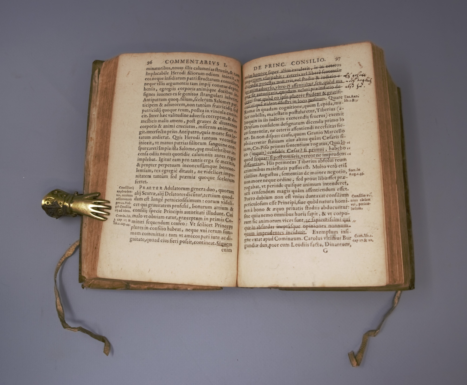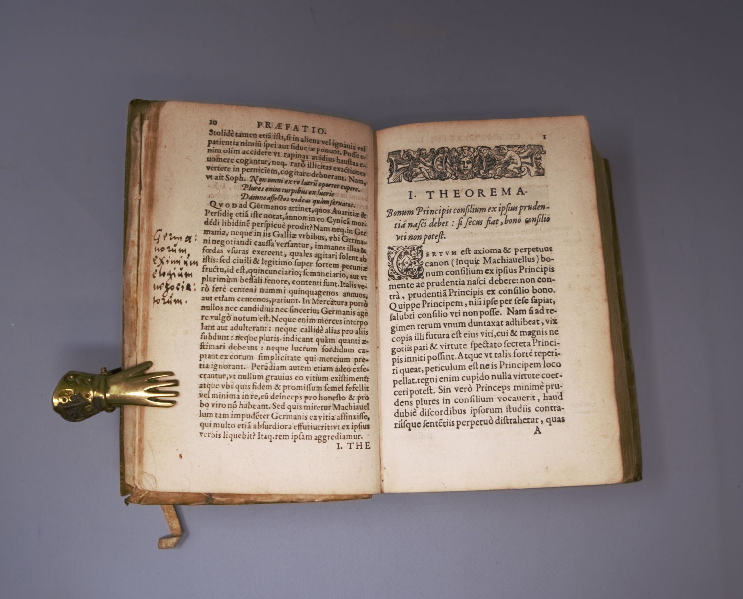 VD 16 G 1301. Adams G 436. – Erste lateinische Ausgabe des zuerst 1576 auf Französisch erschienenen "Anti-Machiavels" des französischen Rechtsgelehrten Innocent Gentillet (um 1532-1588), die erste deutsche Übertragung folgte dann 1580 bei Georg Rabe in Frankfurt. – Etwas fingerfleckig, stellenweise mit verblasstem Feuchtigkeitsrand, anfangs einige alte Annotationen.
