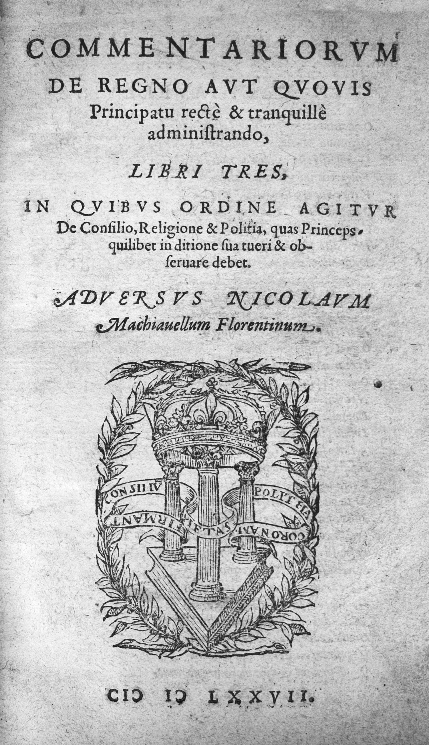 (Gentillet, Innocent). Commentariorum de regno aut quovis principatu rectè & tranquillè administrando, libri tres. Adversus Nicolaum Machiavellum Florentinum. 6 Bl., 20, 708 S., 6 Bl. Mit Holzschnitt-Druckermarke. 17 x 11 cm. Flexibles Pergament d. Z. (etwas fleckig und berieben) mit 4 Schließbändern. (Wohl Genf, Jacob Stoer), 1577.
