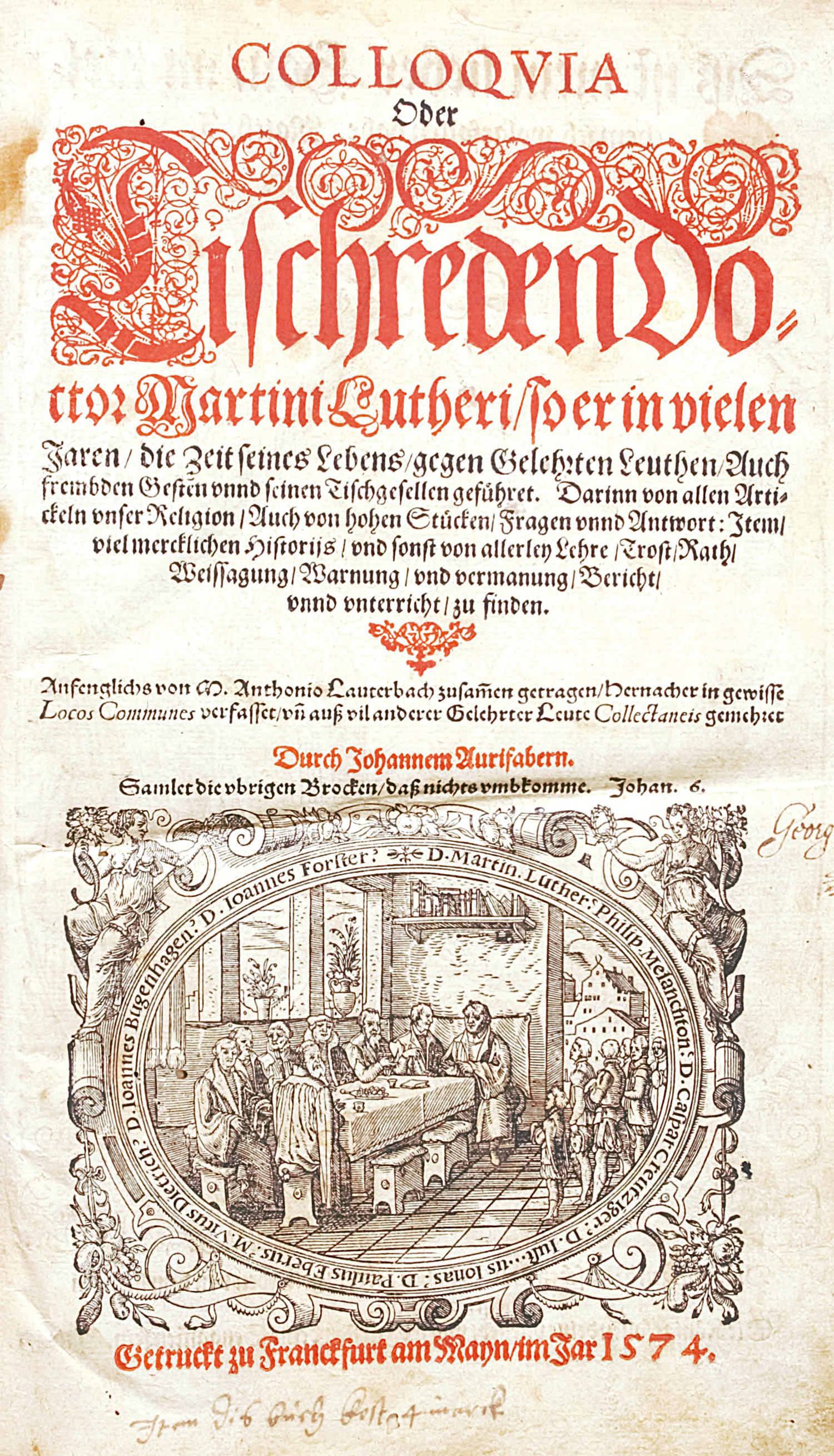Luther, Martin. Colloqvia oder Tischreden. Anfenglichs von M. Anthonio Lauterbach zusammen getragen, hernacher gemehret durch Johannem Aurifabern. 10 nn., 446 num., 37 nn. Bl. Titel in Rot und Schwarz. Mit szenischem Titelholzschnitt, blattgroßem Textholzschnitt auf dem Titel verso, Holzschnittportrait und breiter Holzschnittbordüre auf dem Zwischentitel von Jost Amman. 32 x 21 cm. Halbleder des 18. Jahrhunderts (fleckig und berieben, Kanten mit Schabspuren) mit goldgeprägtem RSchild. Frankfurt, Peter Schmidt und Siegmund Feyerabend, 1573-1574.