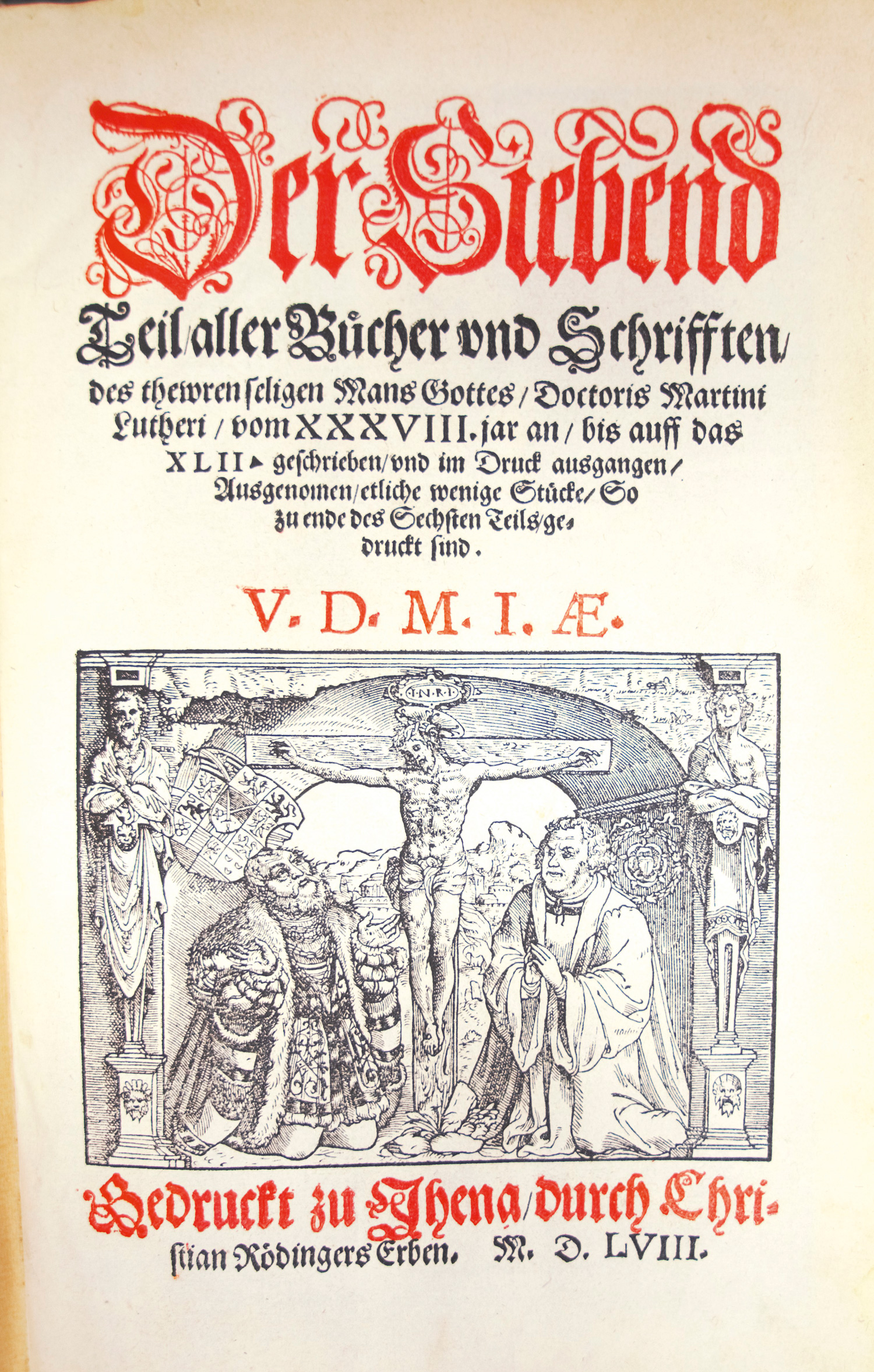 Luther, Martin. Der Siebend Teil aller Bücher und Schrifften...vom XXXVIII jar an bis auff das XLII geschrieben und im Druck ausgangen. Teil VII (von 8) in 1 Band. 4 nn., 476, 1 nn. Bl. Mit großer Holzschnitt-Vignette auf dem Titel und ganzseitigem Text-Holzschnitt. 31 x 19,5 cm. Blindgeprägtes Schweinsleder d. Z. (berieben und fleckig) mit goldgeprägtem RSchild, VDeckel datiert "1561" und 1 (von 2) Messingschließen. Jena, Erben, Christian Rödingers, 1558.