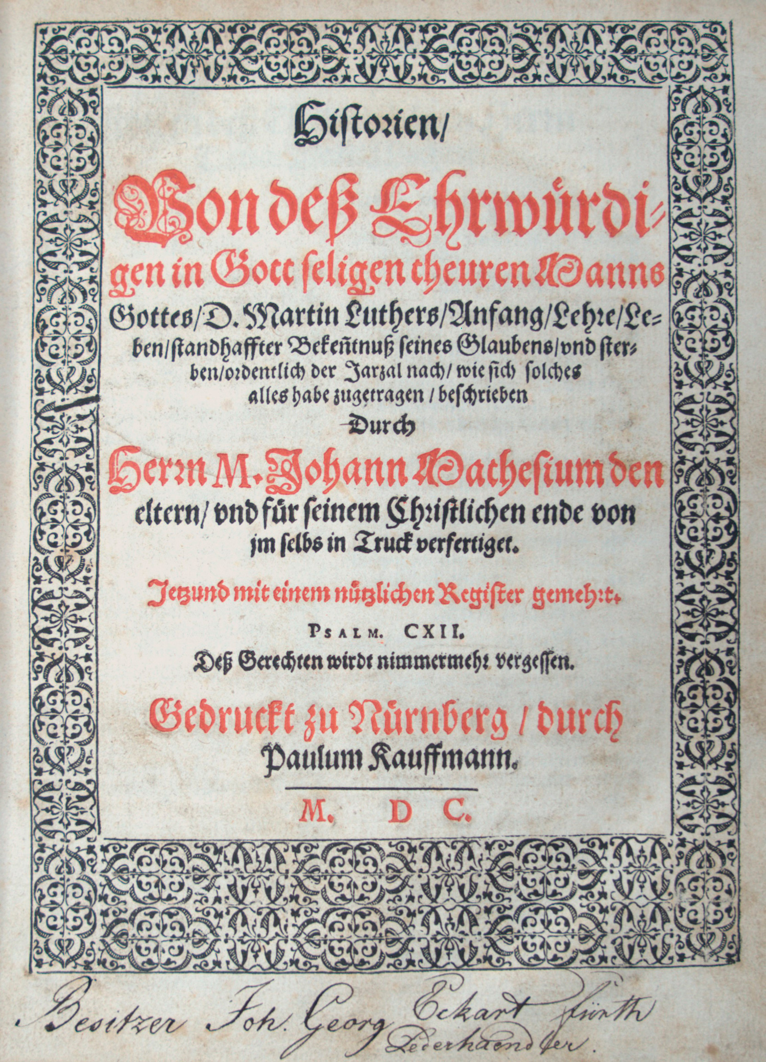Mathesius, Johannes. Historien, von deß ehrwürdigen in Gott seligen theuren Manns Gottes, D. Martin Luthers, Anfang, Lehre, Leben, standhaffter Bekenntnuß seines Glaubens, vnd sterben, ordentlich der Jarzal nach, wie sich solches alles habe zugetragen, beschrieben. Titel in Schwarz und Rot. 16 nn., 199 (von 200) num. Bl. 19 x 15,5 cm. Späterer Pappband mit Pergamenthandschrift des 15. Jh. (stärker gebräunt, etwas berieben). Nürnberg, Paul Kauffmann, 1600.