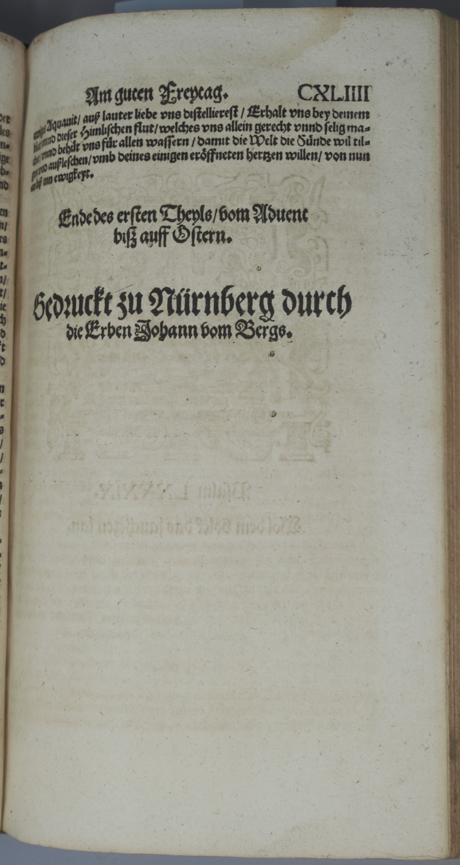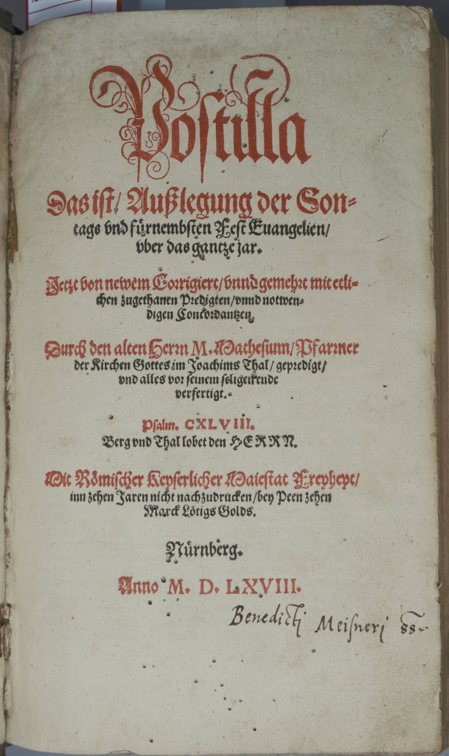 Vgl. VD16 M 1534 und 1535 (ohne Digitalisat bzw. Kollation). – Wohl eine Mischauflage der vierteiligen Evangelien-Postille des "Bergpredigers" von Joachimsthal in Böhmen Johannes Mathesius (1504-1565), ein "Muster protestantischer Kanzelberedsamkeit" (NDB XVI, 369). Mathesius war 1540 für zwei Jahre in Wittenberg, wo er in engem Kontakt mit Luther stand und dessen Tischreden und Predigten dokumentierte. – Titel mit hs. Besitzvermerk ("Benedicti Meisneri 88"), fl. Vorsatz mit mehreren zeitgenössischen Einträgen. Insgesamt etwas angestaubt und fleckig, mehrere Blatt zumeist am Schluss auch mit Feuchtigkeitsrand im oberen Bug, das Papier dort etwas brüchig. Anfangs leicht wurmstichig.