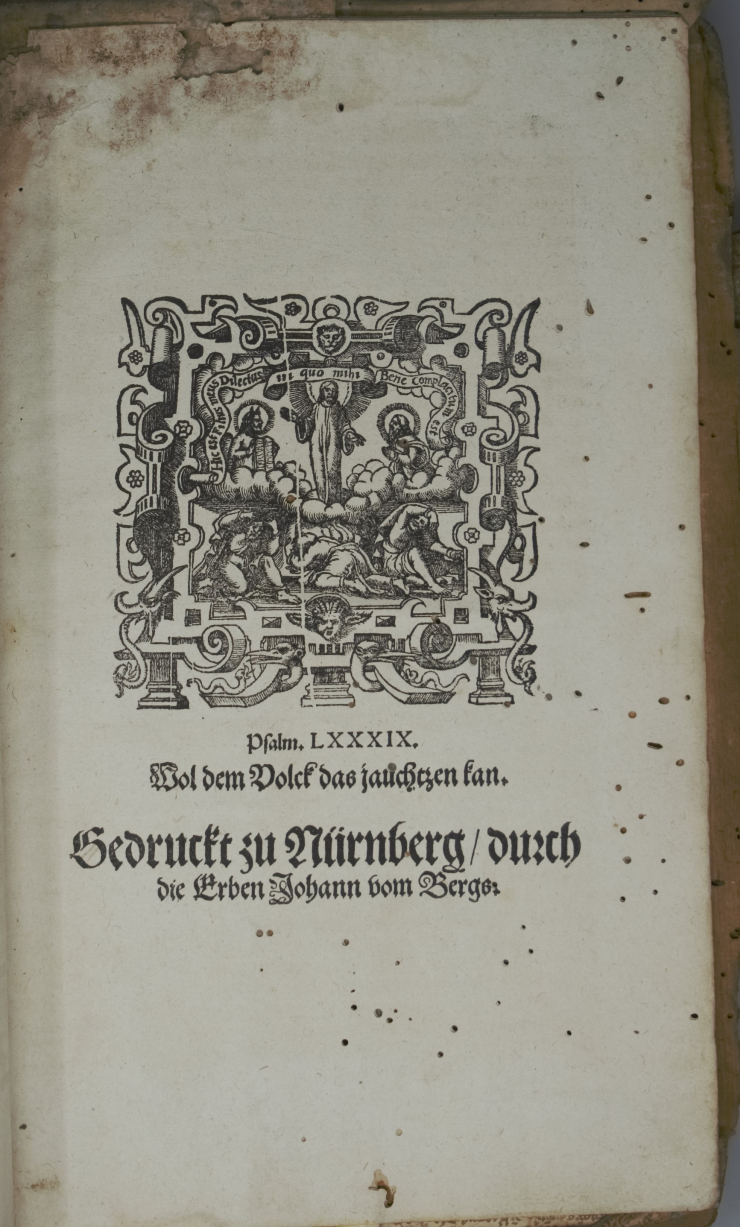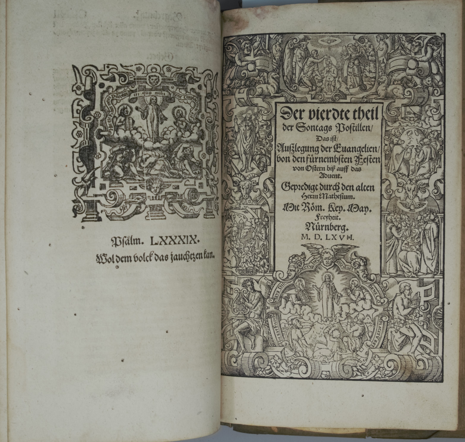 Mathesius, Johannes. Postilla Das ist, Außlegung der Sontags und fürnembsten Fest Evangelien, uber das gantze jar. Jetzt von newem Corrigiert, unnd gemehrt mit etlichen zugethanen Predigten, unnd notwendigen Concordantzen. 4 Teile in 1 Band. 4 nn., CXLIIII num. Bl.; CCXII num. Bl.; CLXII num. Bl.; CXI num., 1 nn. Bl. Titel in Rot und Schwarz. Mit 3 (2 wiederholten) szenischen Holzschnitt-Bordüren, 3 (wiederholten) Holzschnitt-Druckermarken und 88 Textholzschnitten von Hans Brosamer u. a. 31 x 18,5 cm. Holzdeckelband d. Z. mit blindgeprägtem Schweinslederrücken (etwas fleckig und berieben, leicht wurmstichig, Lederbezug teils gelöst, Ecken teils beschabt) und Bezugspapier aus einer zeitgenössischen Handschrift sowie 2 intakten Messingschließen. Nürnberg, Erben Johann Berg, 1567-1568.
