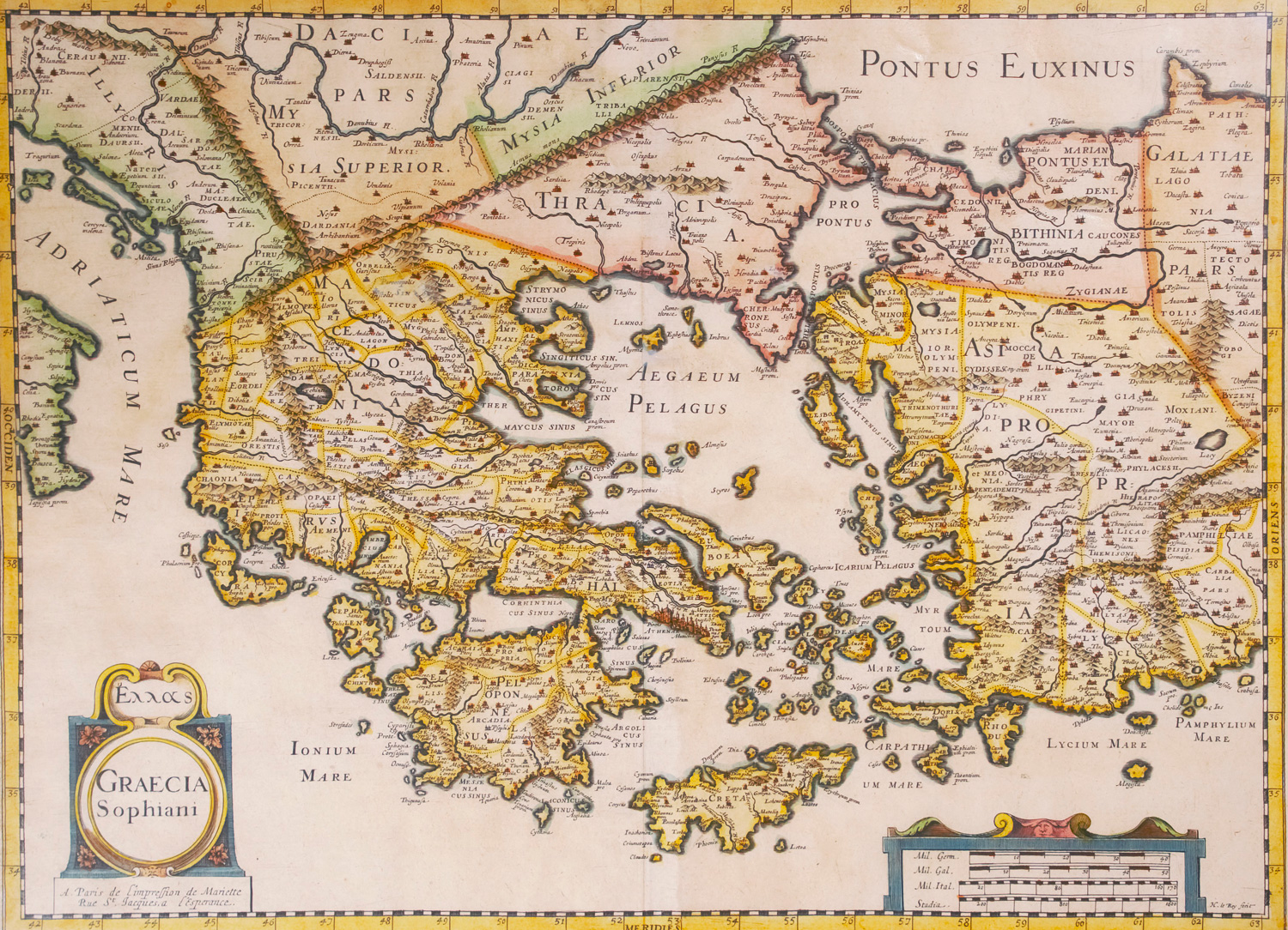 Van den Broecke 215. – Griechenland und Kleinasien aus dem "Theatrum Orbis Terrarum" des Abraham Ortelius (1529-1589), das gemeinhin als der erste moderne Atlas gilt und damals eines der teuersten Bücher überhaupt war. Es erfuhr zwischen 1574 und 1612 mehrere Auflagen, unser Blatt stammt aus einer der lateinischen Ausgaben mit entsprechendem Text verso. Die hübsche Kartusche als Aedikula mit zwei Atlanten auf gedrehten Beinen mit Muschelkalotte, ganz "alla antica".
