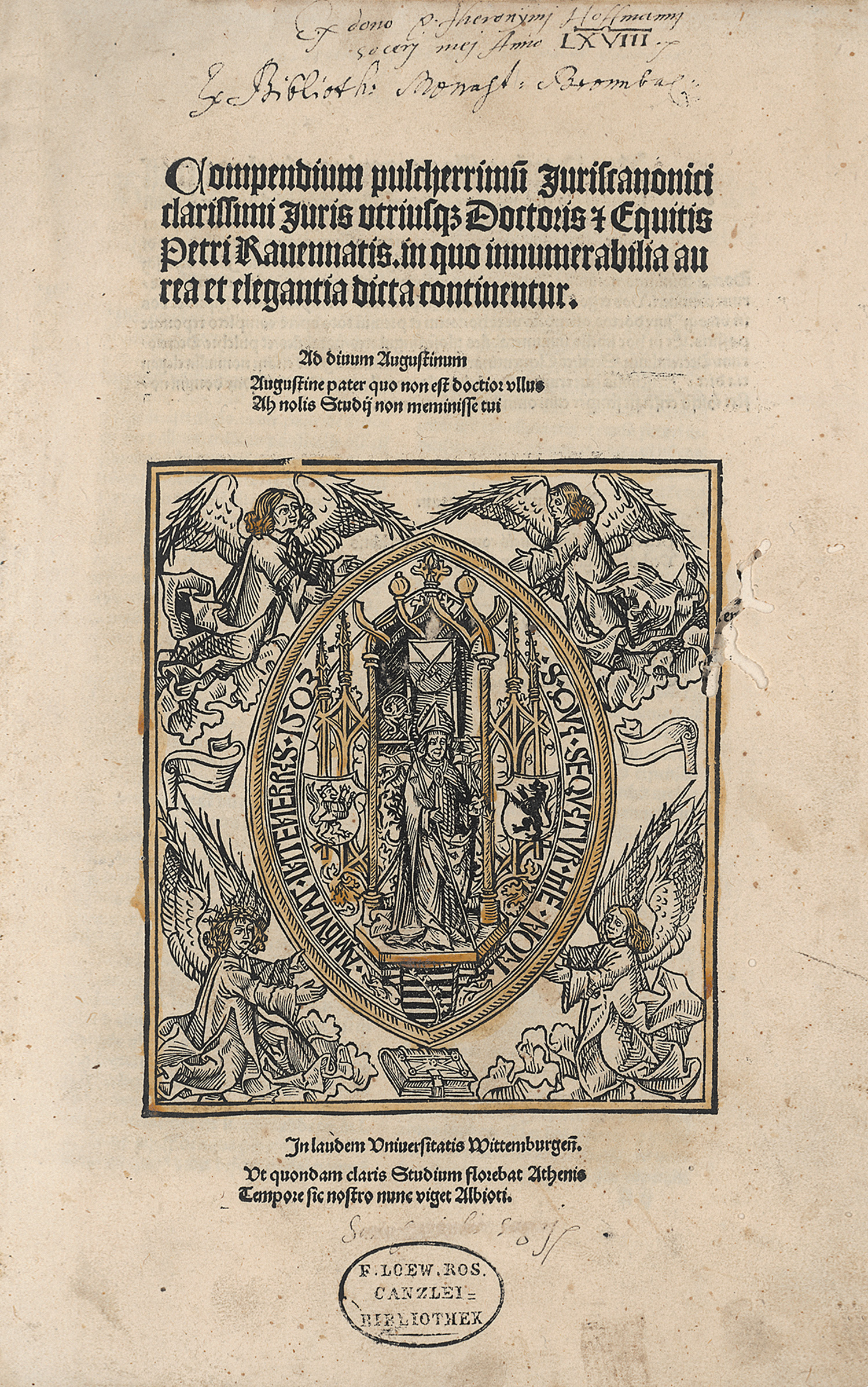 Ravenna, Petrus von. Compendium pulcherrimum juriscanonici clarissimi juris utriusque Doctoris et Equitis Petri Ravennatis. In quo innumerabilia aurea et elegantia dicta continentur. Teil I-III in 1 Band. 67 (von 85), 130, 109 nn. Bl. Mit teilkolorierter Holzschnitt-Vignette auf dem Titel und Druckermarke am Schluss. 31 x 21 cm. Blindgeprägtes Schweinsleder d. Z. (berieben, fleckig und mit kleinen Fehlstellen) mit hs. RTitel und zwei Messingschließen. Wittenberg, Wolfgang Stöckel, 1504.